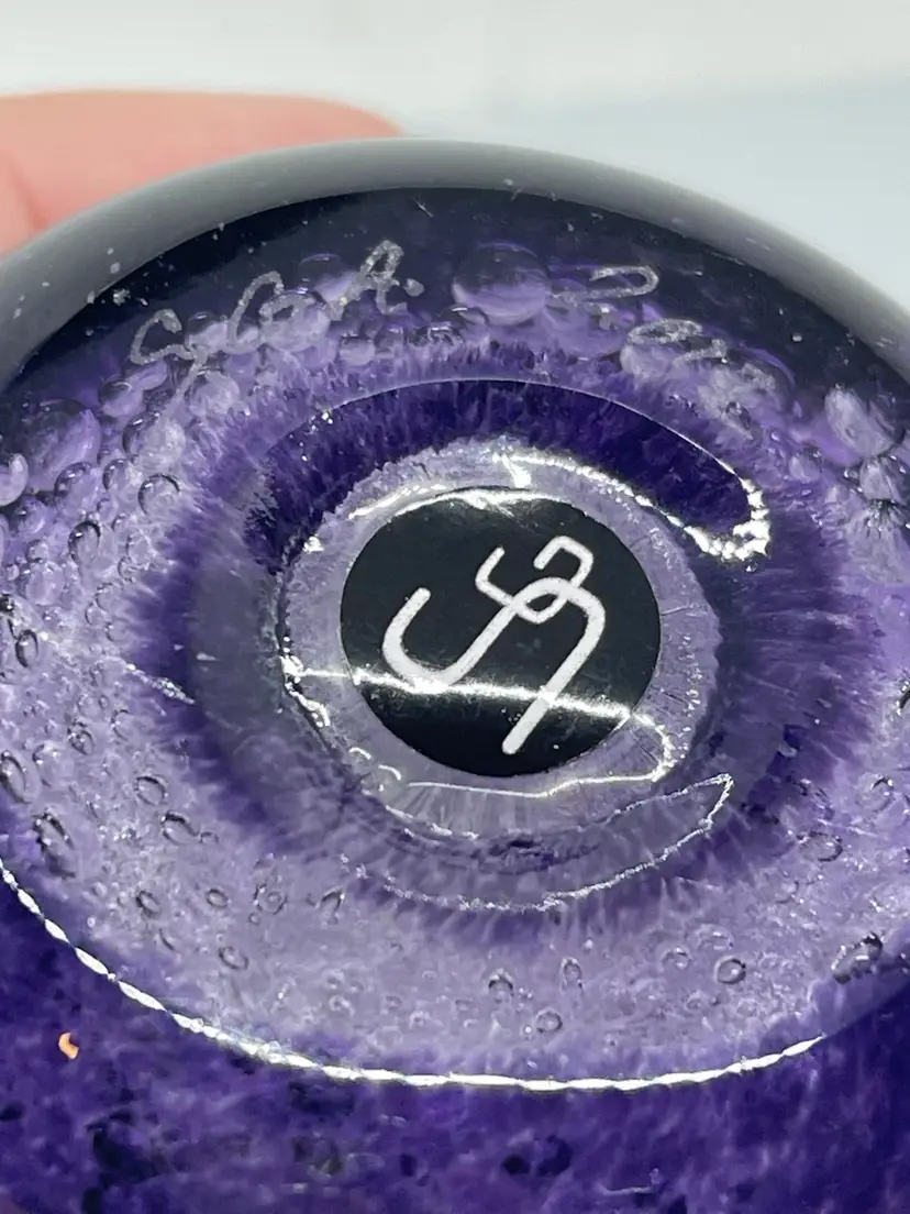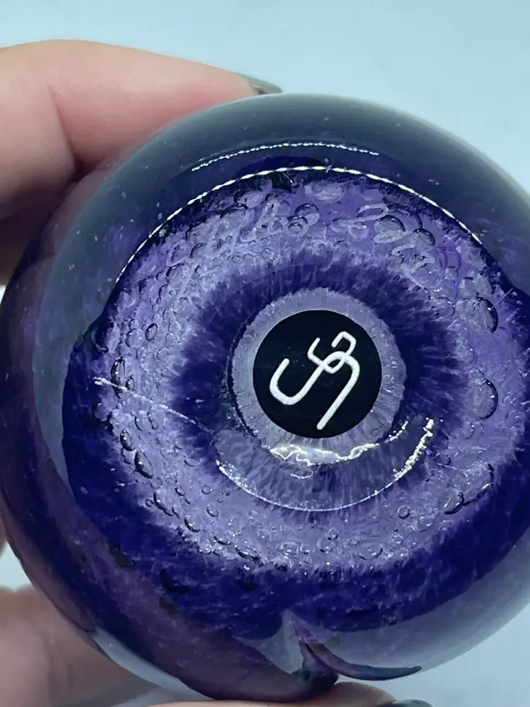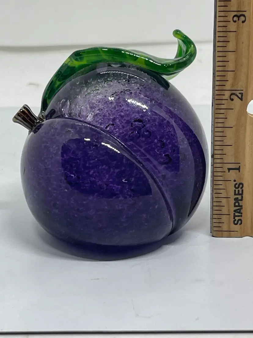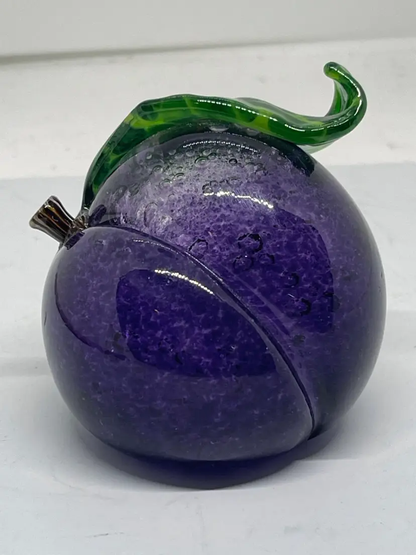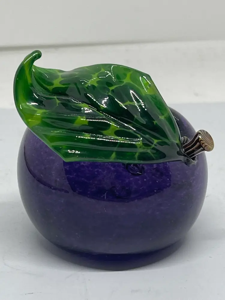 Gorgeous plum paperweight with realistic stem and curled leaf. Dated and signed