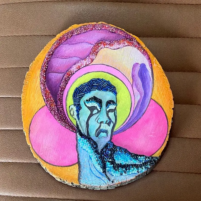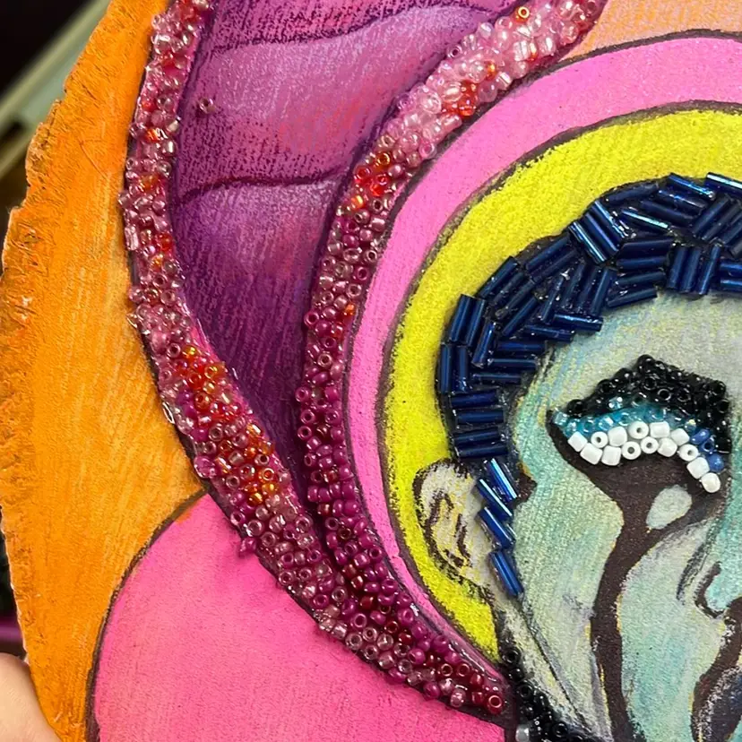 2025 Watercolor, beads, and color pencil on wooden panel. 7 1/2”x 8 1/2”