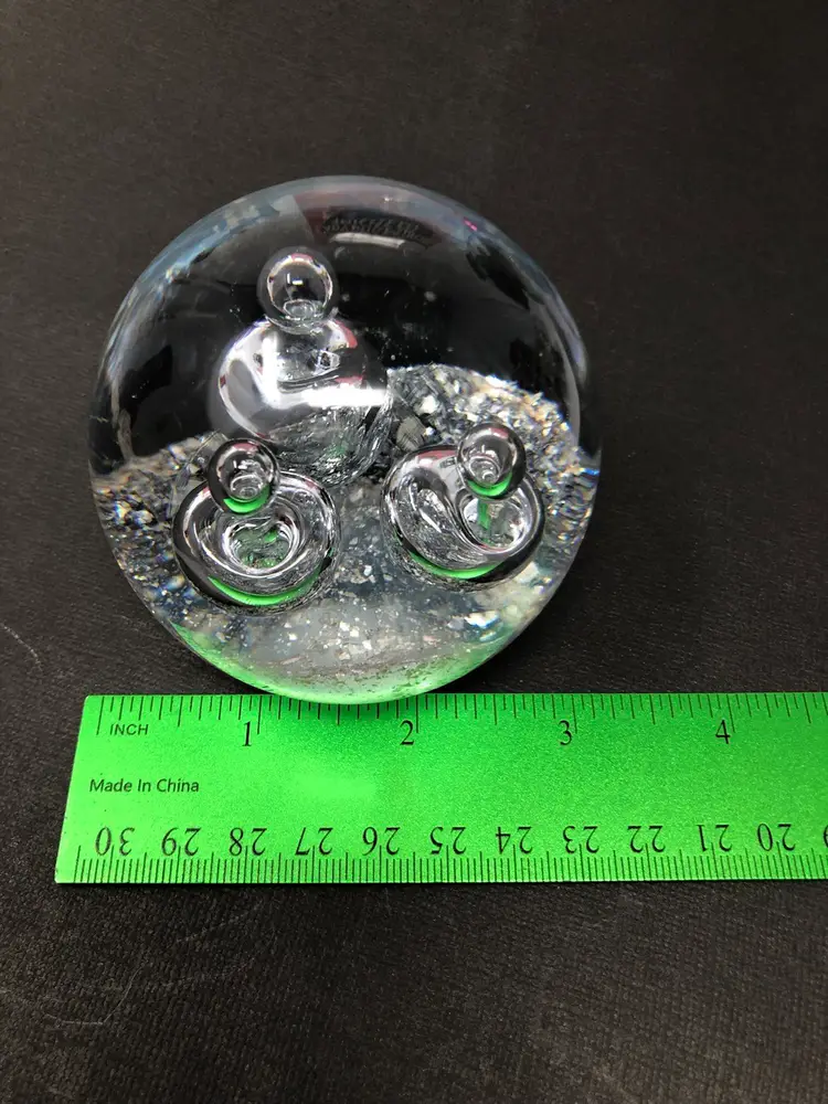 2 3/4" round glass paperweight with controlled bubbles and silvertone flake inside. Smooth cloudy bottom no signatures or labels