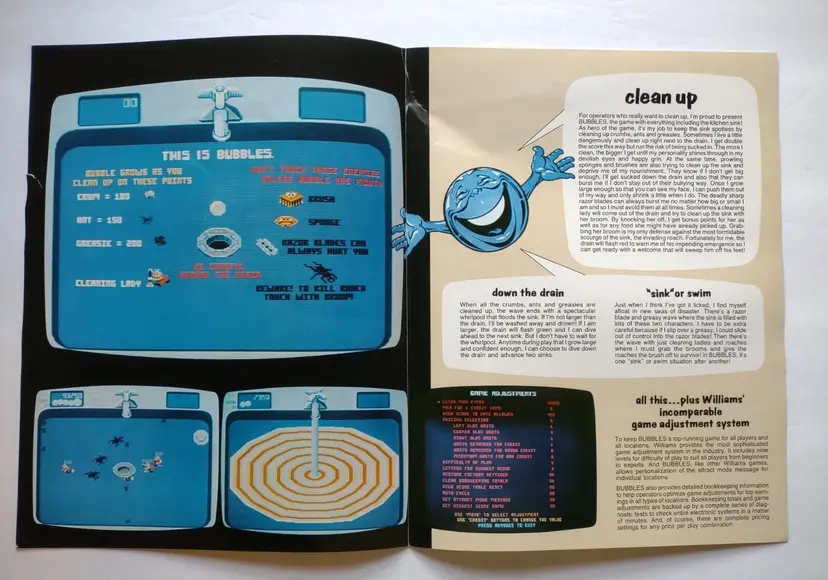 Brand: Williams Year: 1983 Game Title: Bubbles Theme: Retro Gaming Original/Reproduction: Original Material: Paper Country/Region of Manufacture: United States Modified Item: No Arcade: Flyer