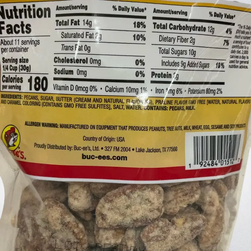 12 Ounces of Glazed Pecan Praline Halves in Resealable Bag; premium quality, fresh and delicious. Buc-ee's is Texas's Premier Provider of Premium Pecans and Pecan Candies Party Time! Gift Time! Snack Time! Office Party! This is the best of Premium Glazed Pecans! Glazed Pecans are a perfect Salad Topping too! Great for anyone who visited Buc-ee's on a Texas roadtrip. Eat at home or share on your next roadtrip.