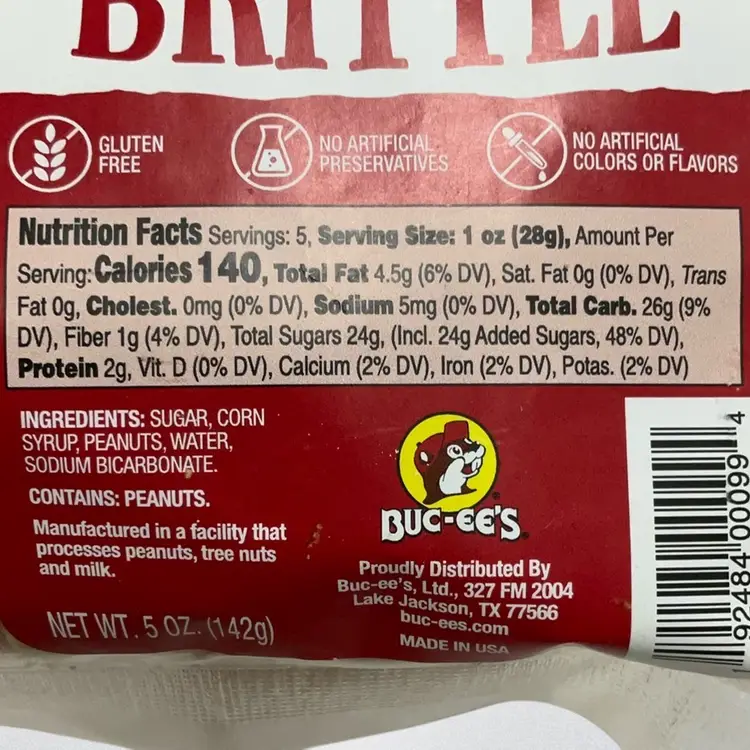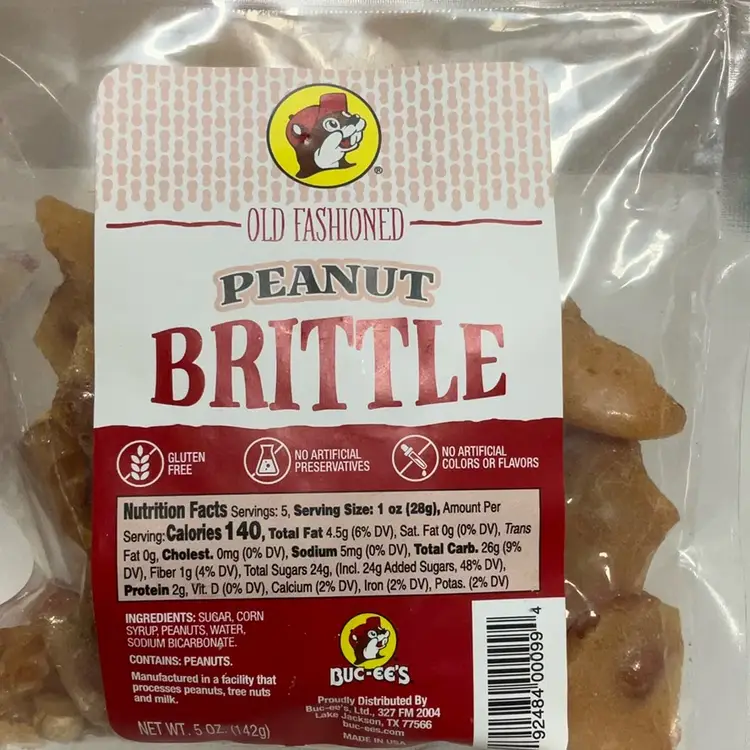 Buc-ee's old fashioned peanut brittle is delicious, crunchy and sure to win over taste buds. Roasted peanuts are embedded in hard candy for a sweet - salty favorite.