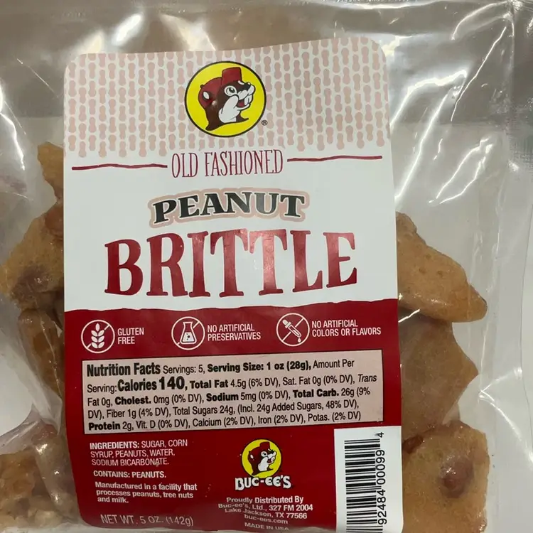 Buc-ee's old fashioned peanut brittle is delicious, crunchy and sure to win over taste buds. Roasted peanuts are embedded in hard candy for a sweet - salty favorite. “I AM AN APPROVED NIKNAX SNACK SELLER. (04/17/25)”