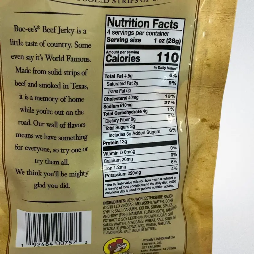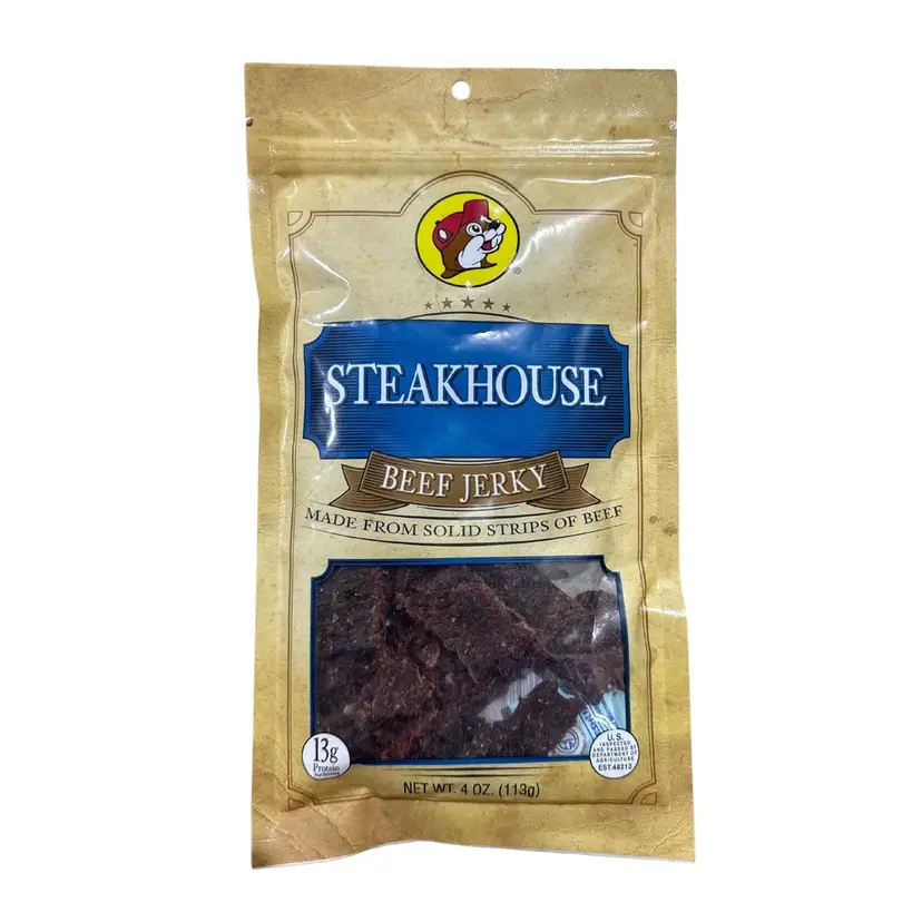 This tasty beef jerky is a staple at Buc-ee's. This flavor is Texas Hill Country Steakhouse Beef Jerky. It is made of 100% beef strips, seasoned and smoked to perfection. Great for Anyone who has Visited Buc-ee's on a Texas Roadtrip. Eat at Home or Share on your Next Roadtrip. What is Buc-ee's? Buc-ee's is a chain of convenience stores located in the Central, North, South, and Southeast regions of Texas. Buc-ee's is known for its very large-format stores (relative to other convenience stores) and a logo depicting Bucky the beaver.