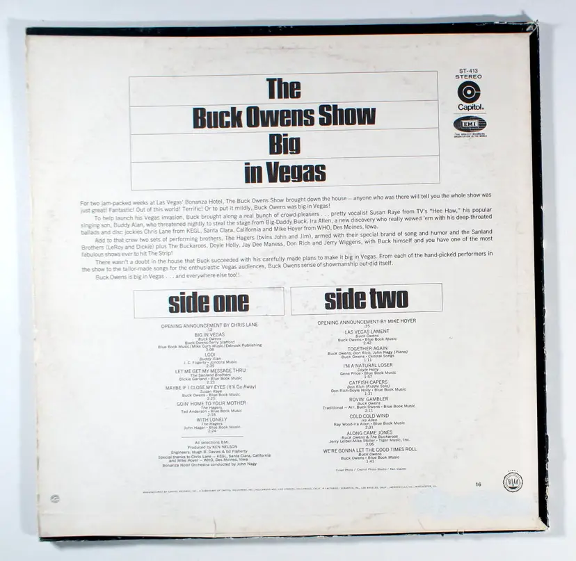 Big in Vegas, by Buck Owens, reached No. 9 on US Country and No. 141 on Billboard 200. The title track was the first single and peaked at No. 5 on the Billboard Hot Country Singles chart. It also reached No. 1 on the RPM Country Tracks chart in Canada.