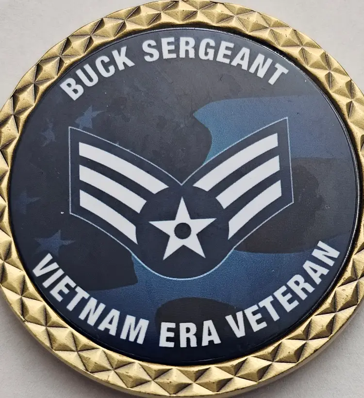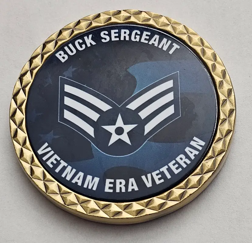 The product is a challenge coin featuring the imagery and sentiment of a Buck Sergeant from the Vietnam Era. The coin serves as a reminder of the sacrifices made by veterans to protect and preserve freedom. It is a collectible item that appreciates the bravery and service of military personnel, especially those who served during the Vietnam War. The design of the coin likely includes symbols and images that represent the military and the era of conflict.