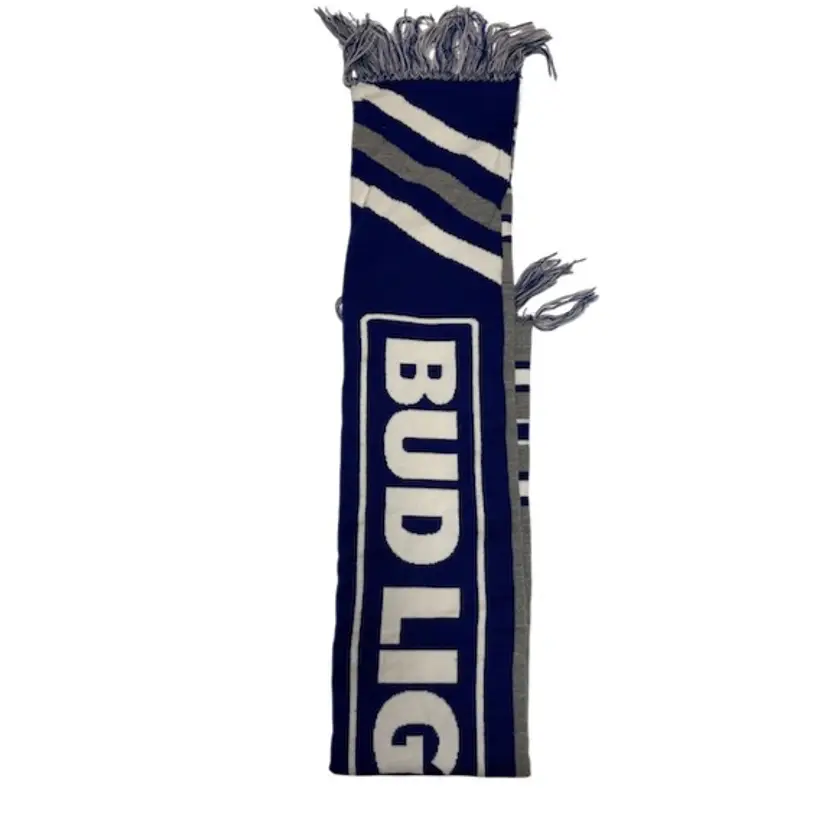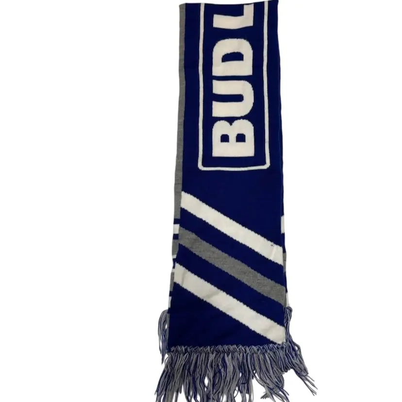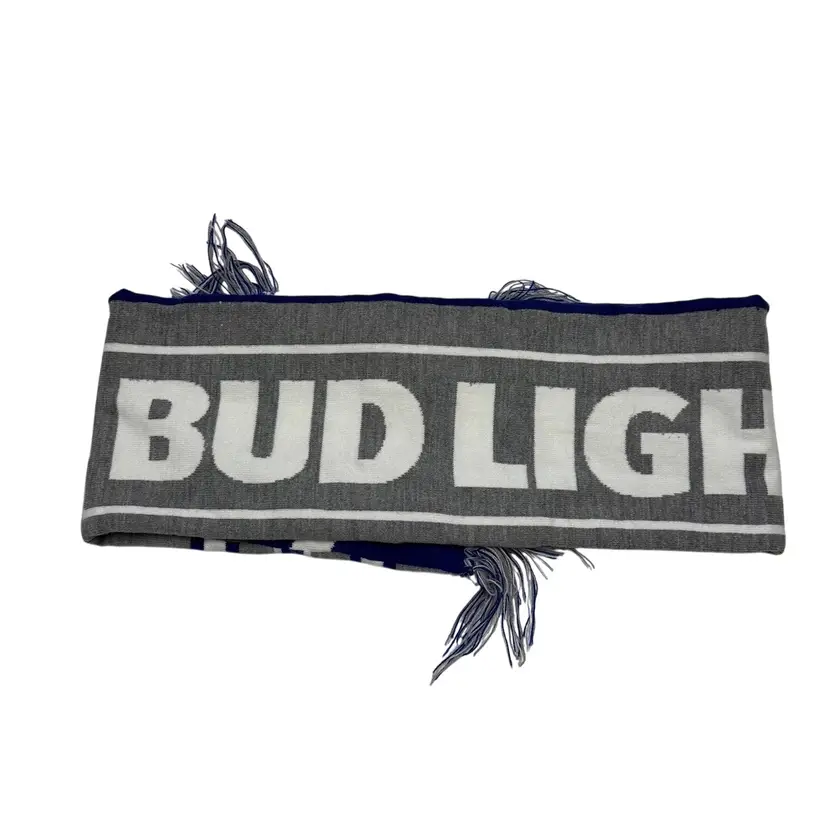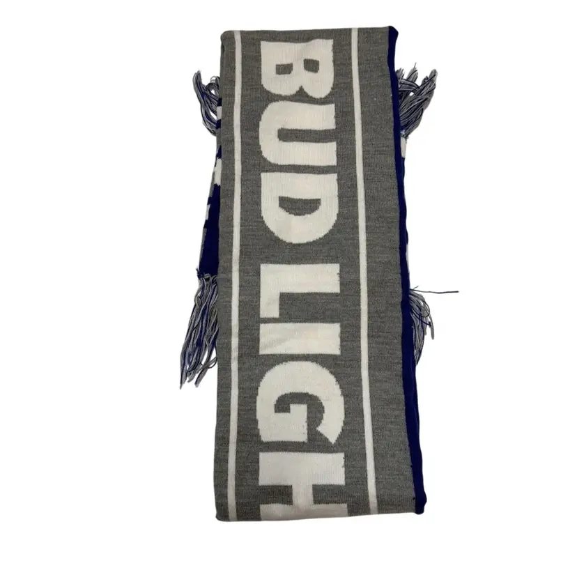 The Budlight Large Font Blue & Gray Reversible Fringe Winter Scarf is a stylish and versatile accessory for both men and women. Made from acrylic fabric with a striped pattern in blue, white, and gray, this scarf features fringe accents for added flair. Perfect for the winter season, it can be worn as a neck warmer or in various other ways to keep you warm and on-trend. Whether you're looking to stay cozy outdoors or add a touch of Budlight and football-themed style to your wardrobe, this reversible scarf is a must-have item for the colder months.