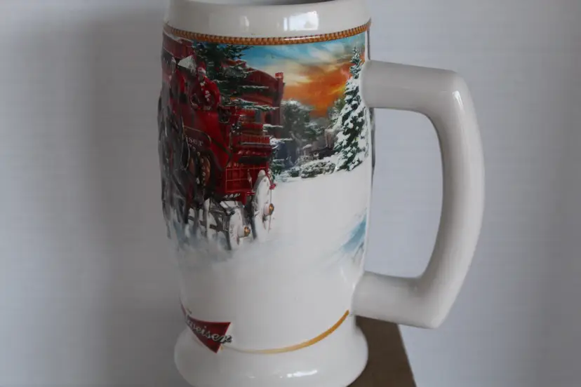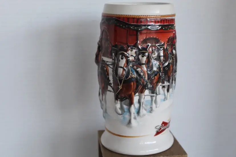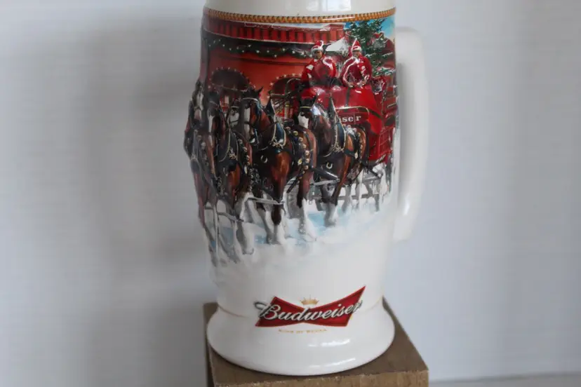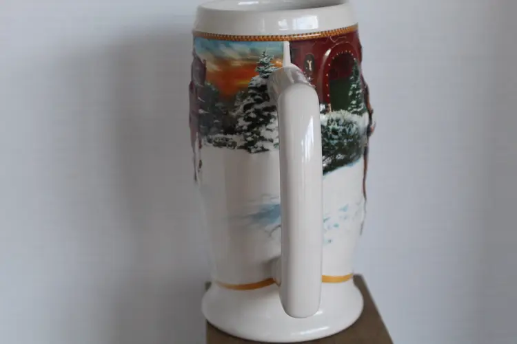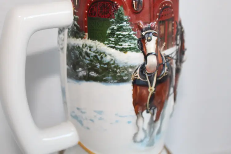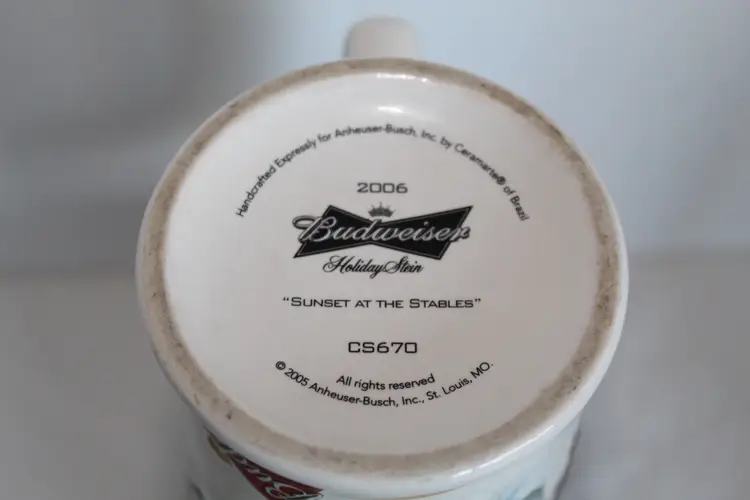 The product is a Budweiser Holiday Beer Stein featuring the iconic Clydesdales design, specifically from the Christmas 2006 collection. This collectible glass stein is a part of the Budweiser Breweriana series and serves as a unique piece for beer enthusiasts. With a theme centered around the holiday season and stables, this Budweiser stein is a special addition to any collection of drinkware or memorabilia. It is 7 inches tall and 4.75 inches from rim to end of handle. The cup itself is 3 inches in diameter.