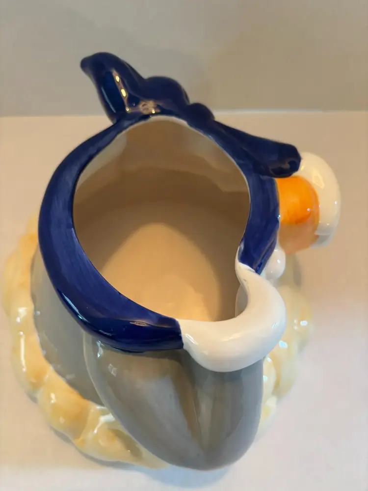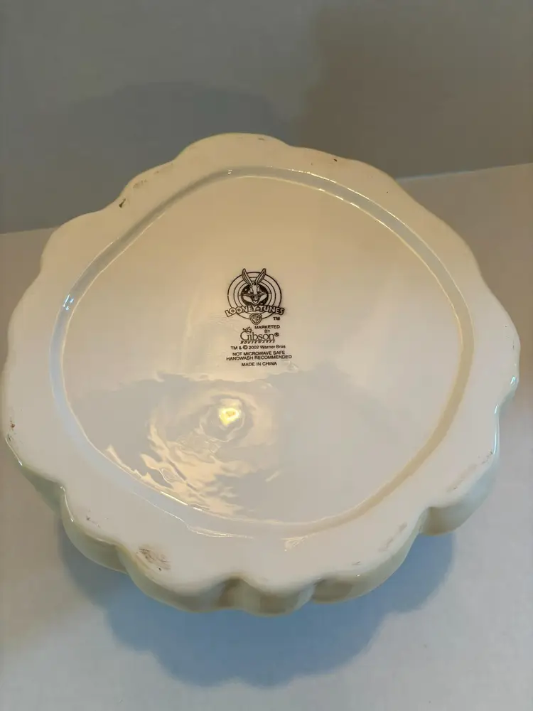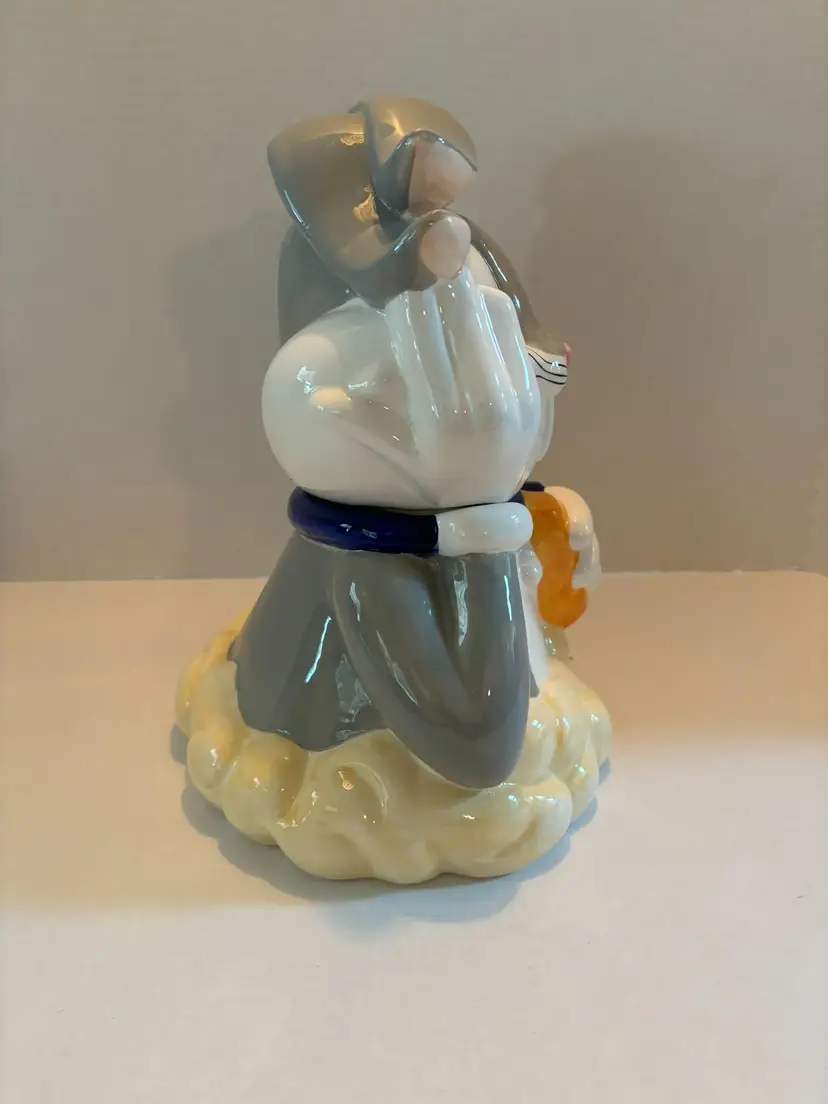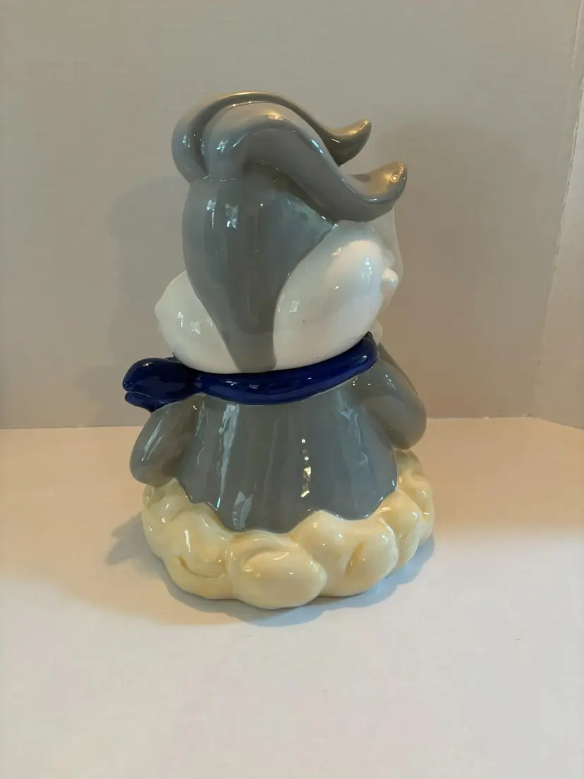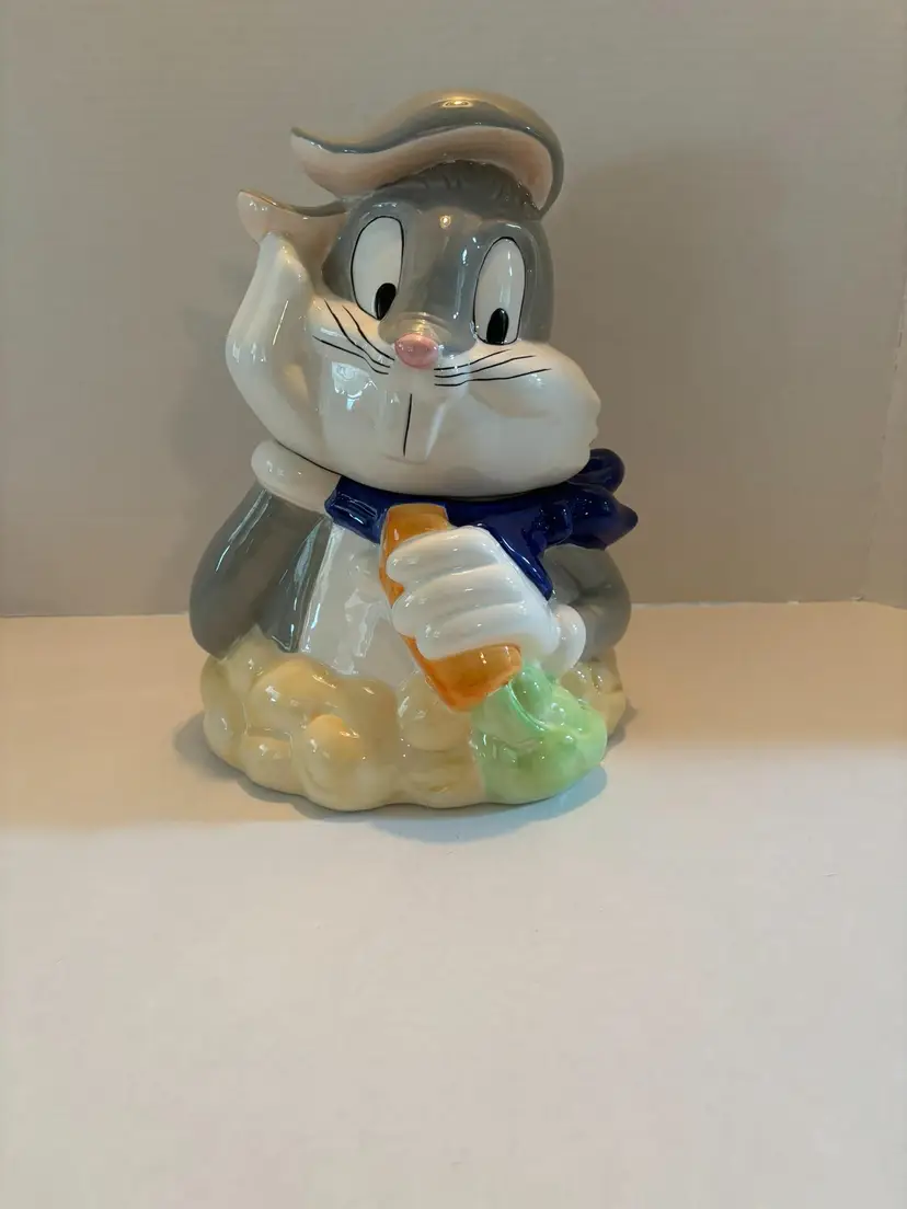 This Bugs Bunny cookie jar is a must-have for Looney Tunes collectors and fans of animation. From the 2002 Collection, the medium-sized jar features Bugs Bunny in his classic pose and multicolor design. The vintage/retro style cookie jar stands at 12 inches tall, with a width of 8 inches and a length of 9.5 inches. The seller is willing to negotiate the price.