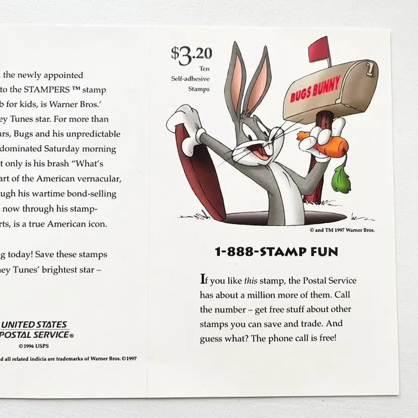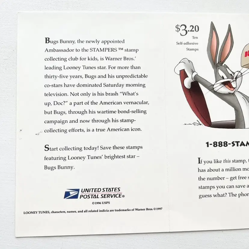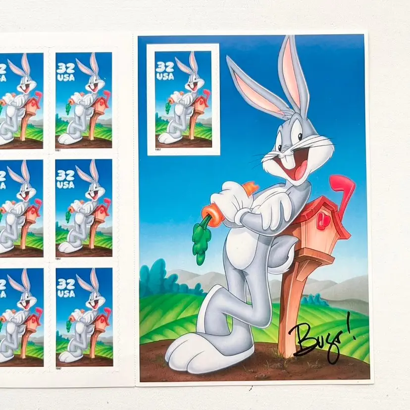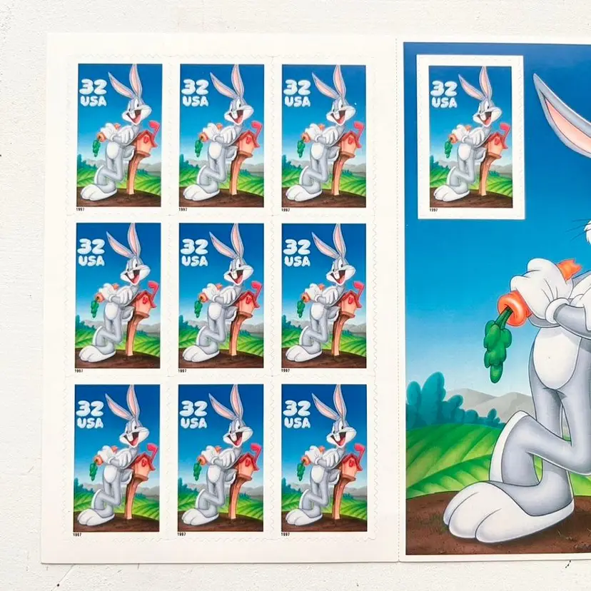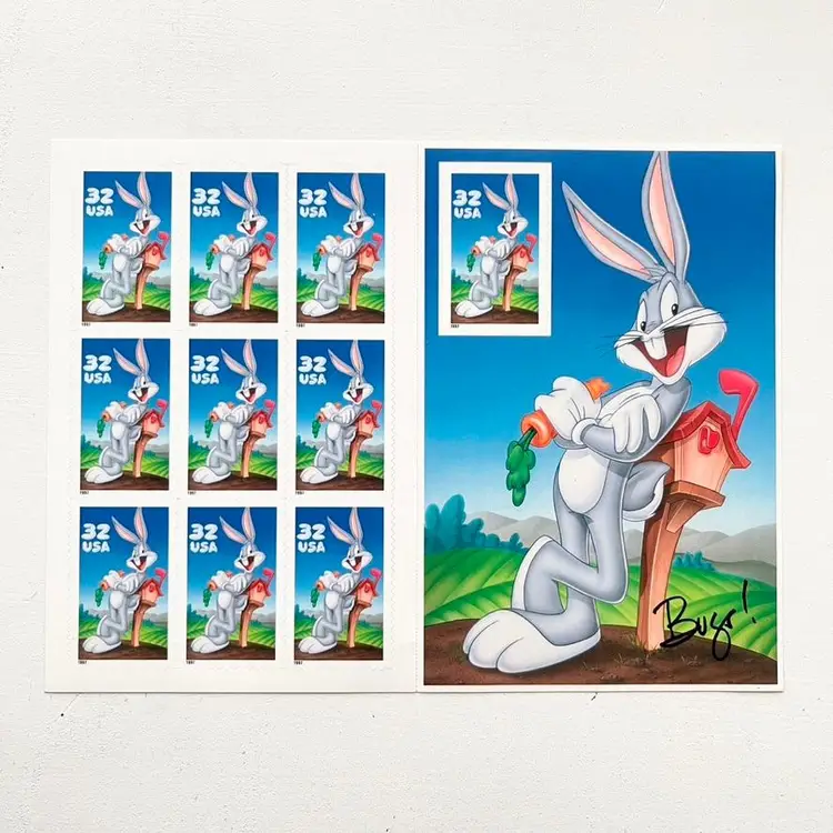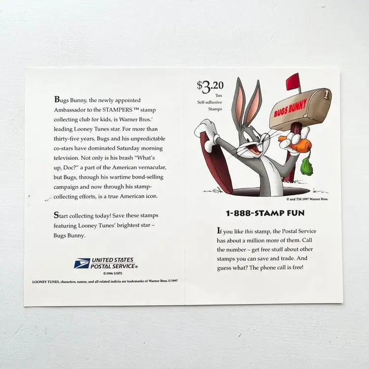 Bugs Bunny Postage Stamp Collection Sticker Sheet Vintage 1990s Looney Tunes Cartoon Character on Saturday Morning Television Sheet of Ten Self-Adhesive Collectible Stamps Block of 9 and 1 stamp on a pane by itself with Larger Image of Bugs Bunny Signed Bugs! 32 USA USPS United States Postal Service Copyright 1996 USPS Copyright and TM 1997 Warner Bros Face Value: $3.20 Three Dollars and Twenty Cents Condition: The back side has a few small ink marks Sheet measures 6-3/4 inches x 5 inches Packaged in a plastic sleeve inside a rigid envelope Visit my store to see more vintage ephemera, advertising, novelties, gifts, estate sale and yard sale finds https://district.net/u/finderspickerspaper SKU B33
