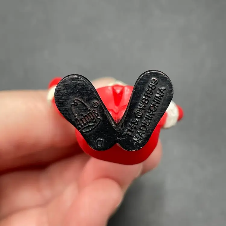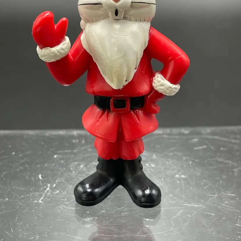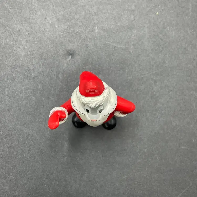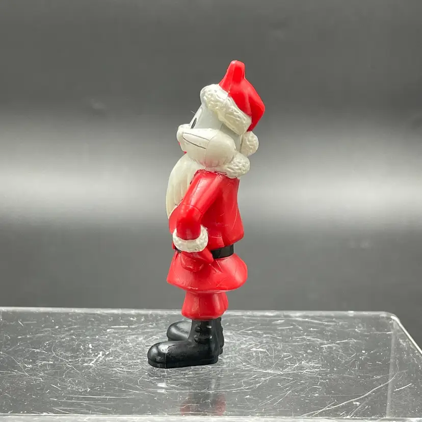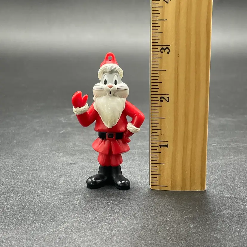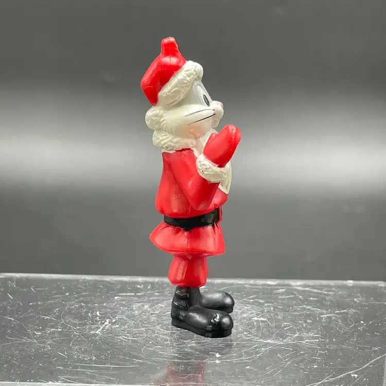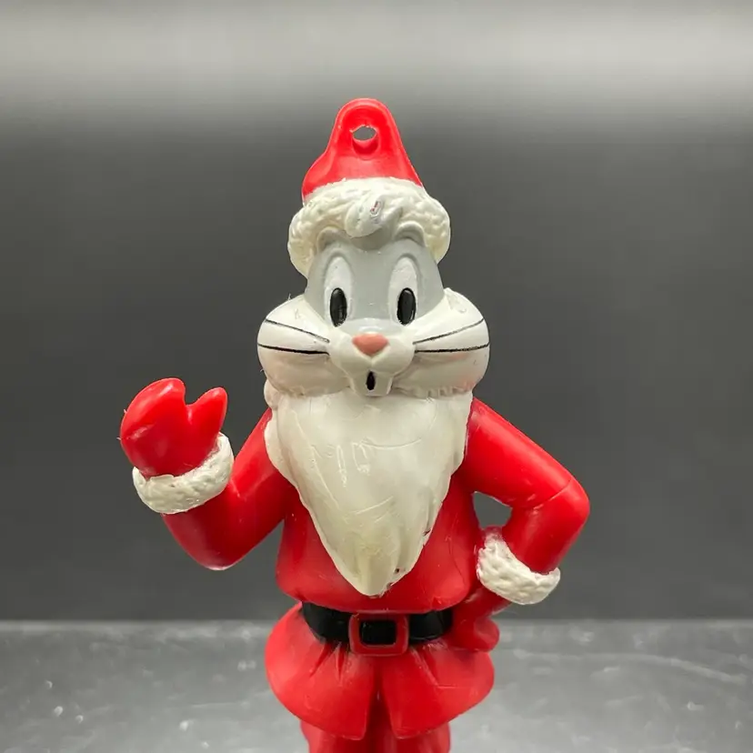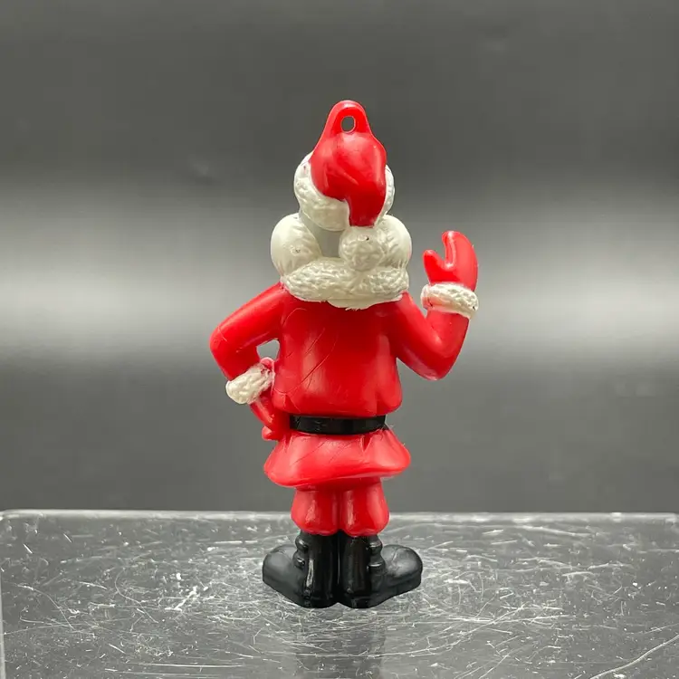 This is a vintage Arby's promotional Bugs Bunny Santa hanging ornament. Marked on the bottom. Made of PVC. Measures approximately 3" tall. There is some wear due to age and use. No major flaws.