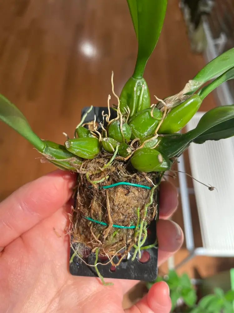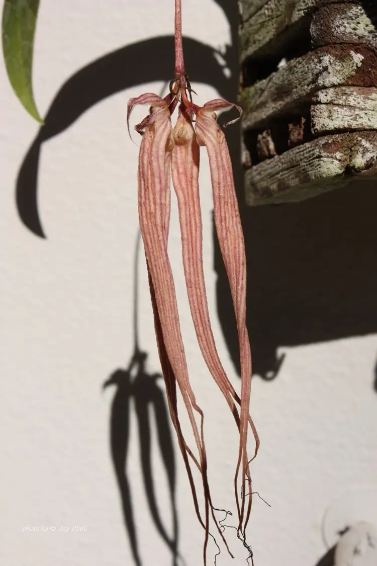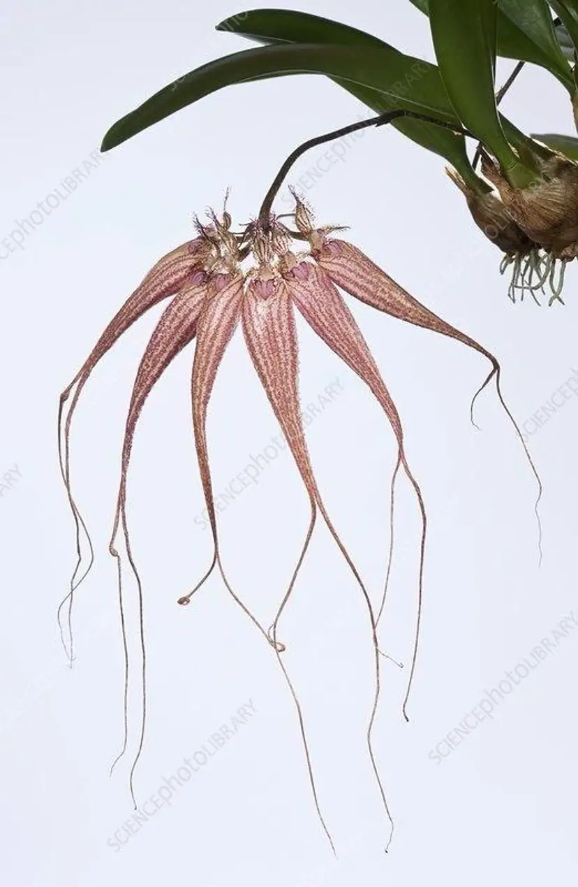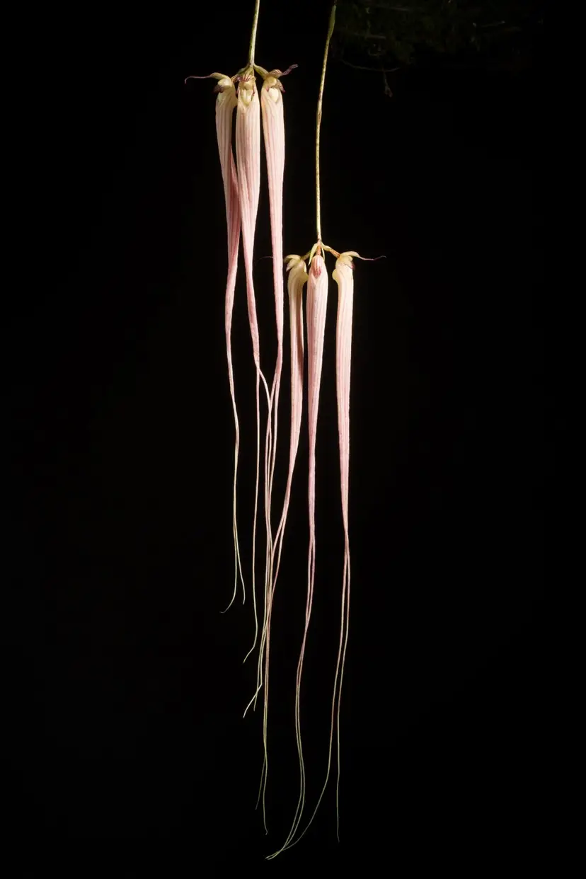 Bulbophyllum longissimum is a unique, compact epiphytic orchid from Thailand and Borneo, known for its very long, shiny leaves and exceptionally long, pale pink, fragrant flowers that appear to float, often blooming in fall.