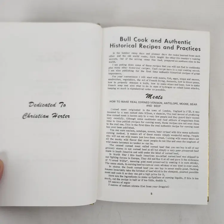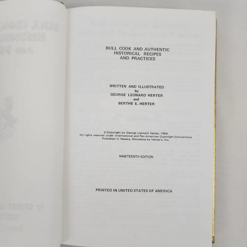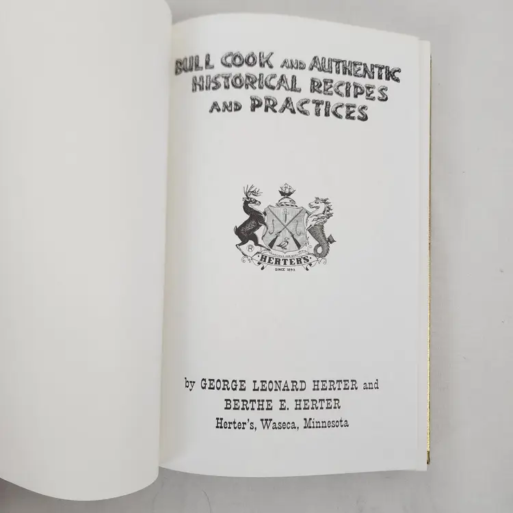 Book Title: Bull Cook and Authentic Historical Recipes & Practices Color: Gold Book Series: Historical Narrative Type: Nonfiction Publisher: George Leonard Herter Original Language: English Vintage: Yes Brand: Na Publication Year: 1971 Type: Activity Book Format: Hardcover Language: English ISBN: NA Author: George Leonard Herter, Berthe E. Herter Features: Illustrated Genre: Cookbooks Topic: Baking, Classic Recipes, Comfort Food, Cooking, Desserts, Food, Home Cooking, Homesteading, Wild Game Country/Region of Manufacture: United States