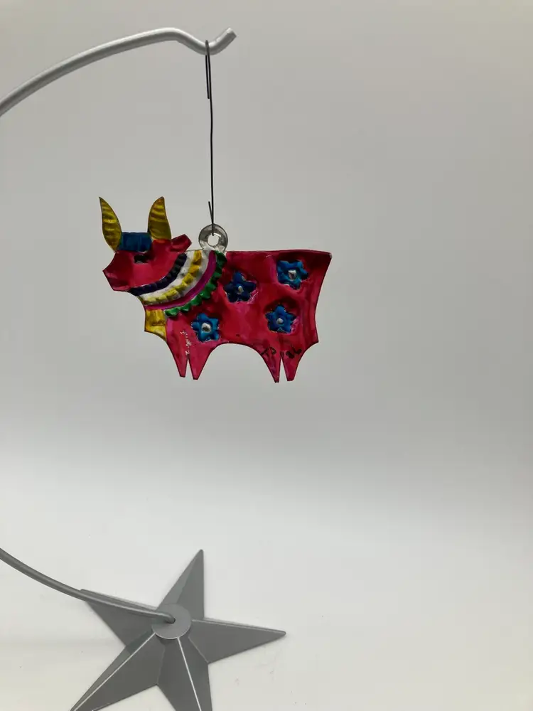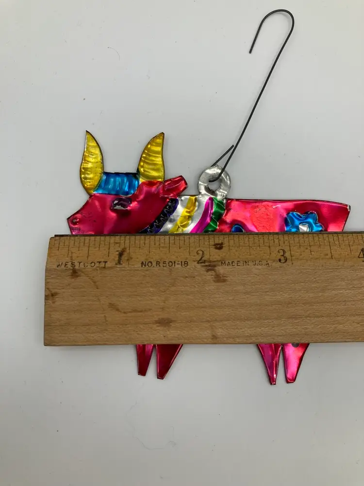 If you mess with the bull, you get the horns. Mexican folk art ornament is painted on both sides. Good vintage condition with some paint loss. Marked TJ ‘86.