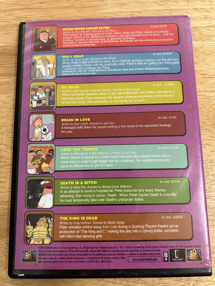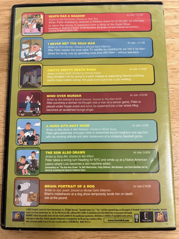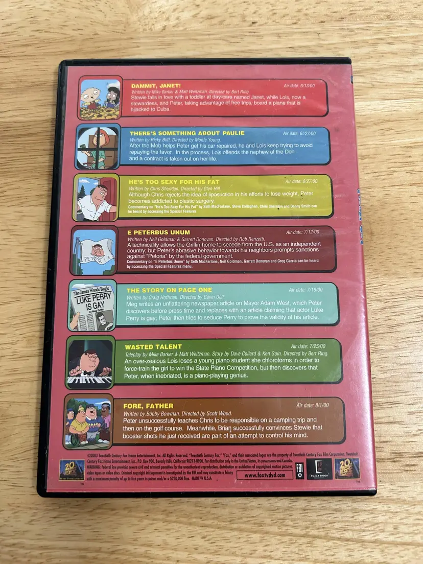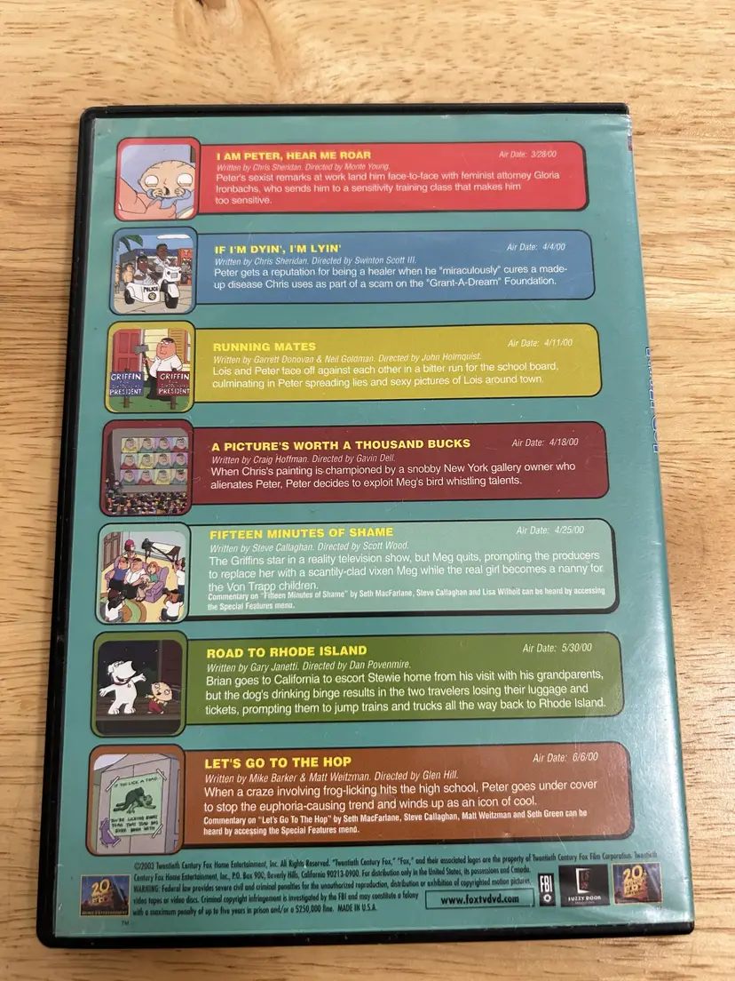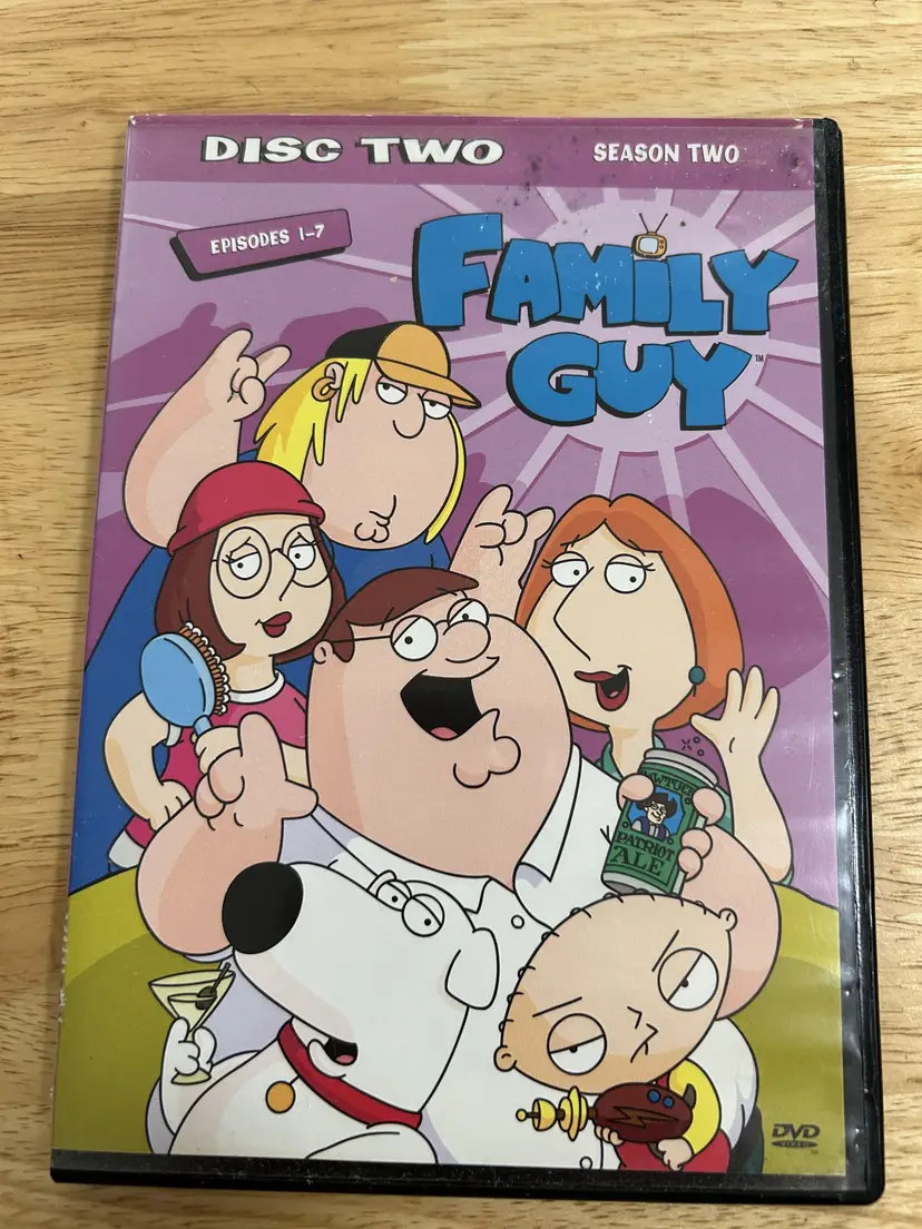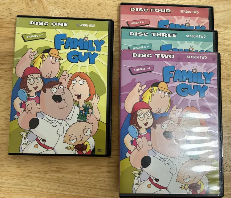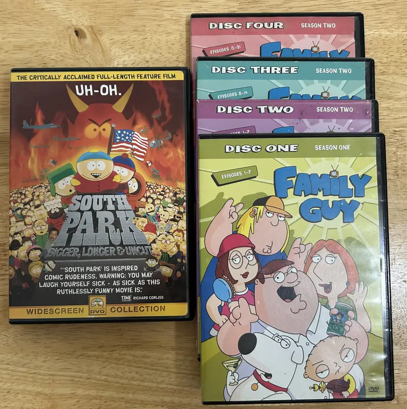 South Park 1999 Feature Film and Family Guy Season One Episodes 1-7, Season Two Episodes 1-7, Season Two Episodes 8-14 and Season Two Episodes 15-21.
