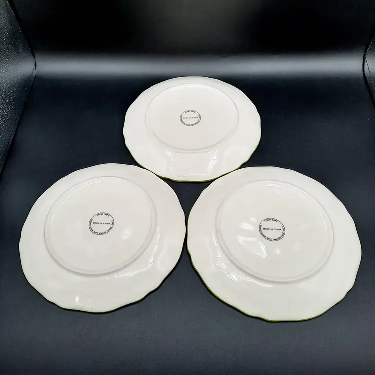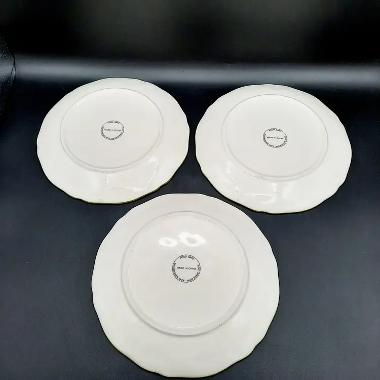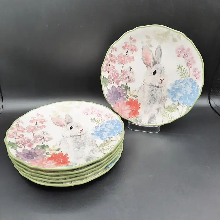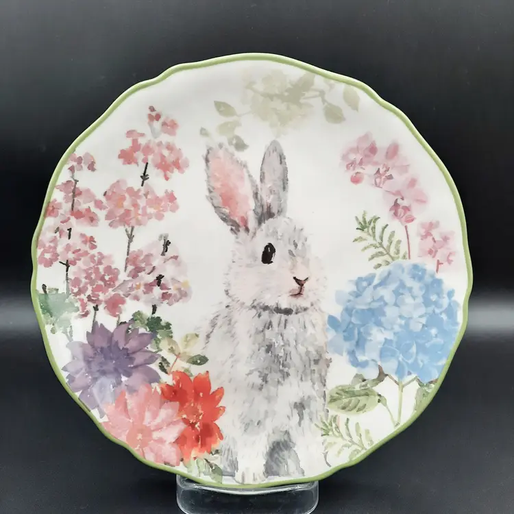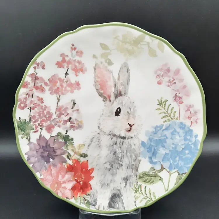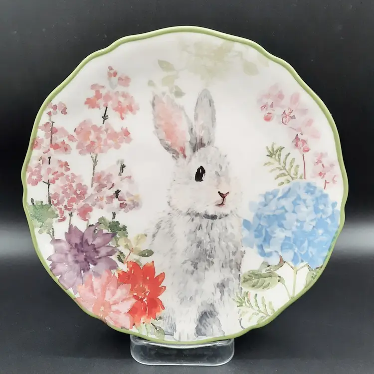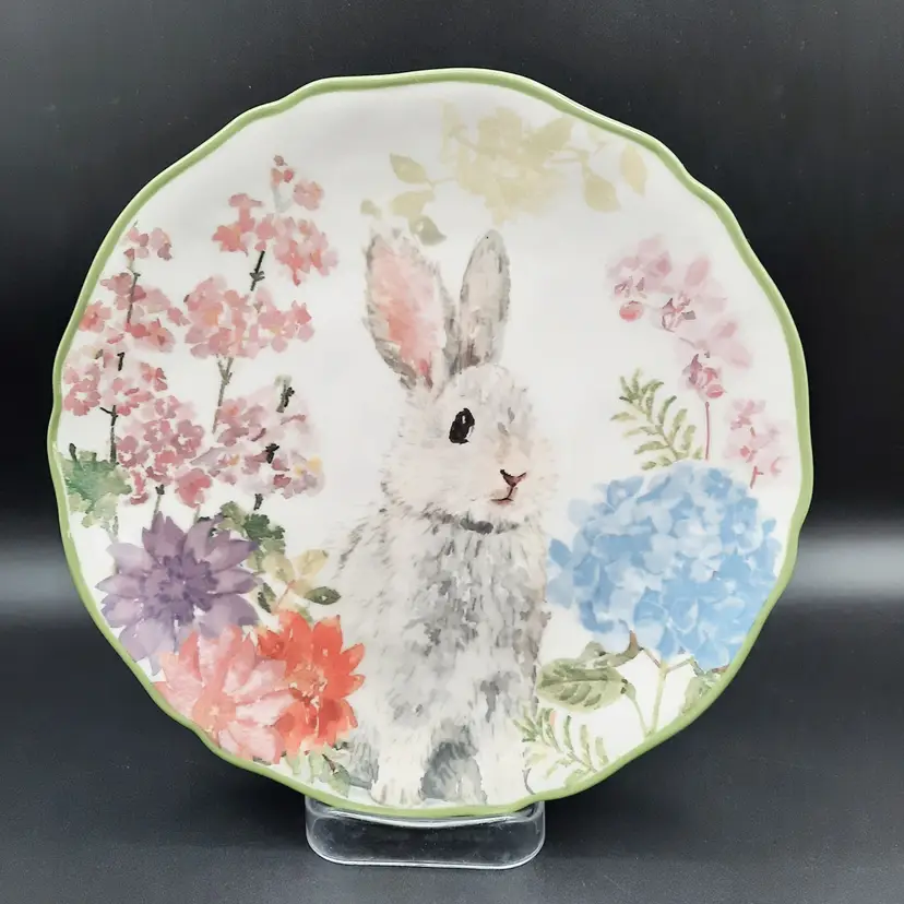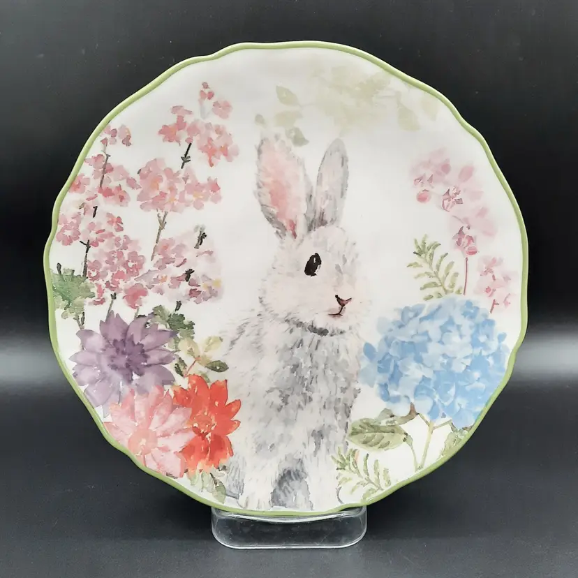 These sweet 8 1/2" plates have a pastel floral and bunny design with a green wavy rim, excellent condition