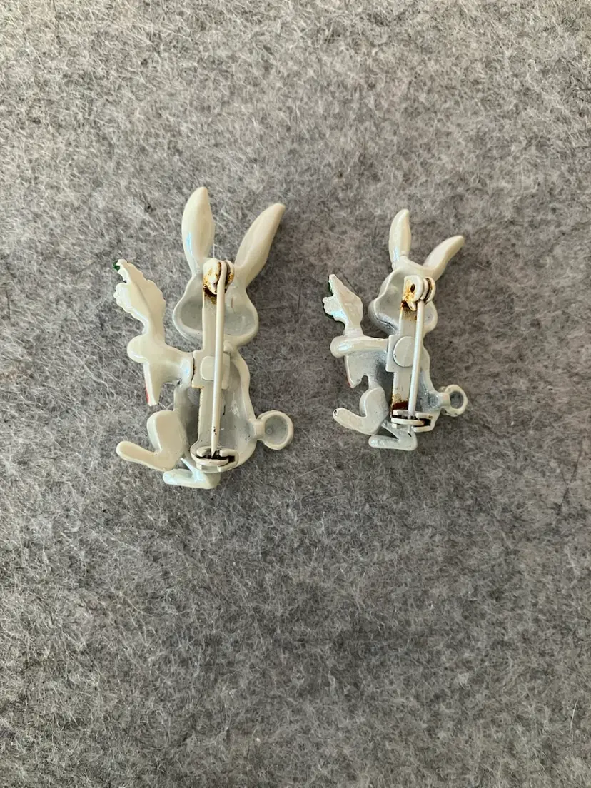 Vintage Bunny Rabbit White Iridescent Enamel Pins. Holding Carrots with Green Tops. Set of 2. 1-3/4” L X 3/4” W 1-1/4” L X 1” W Preowned Excellent Condition. #B65