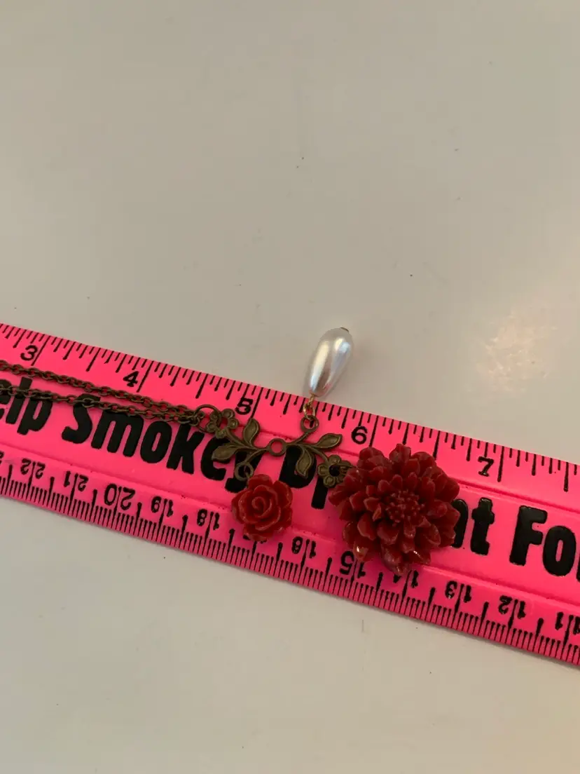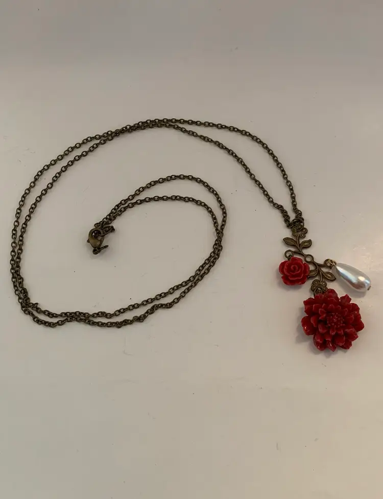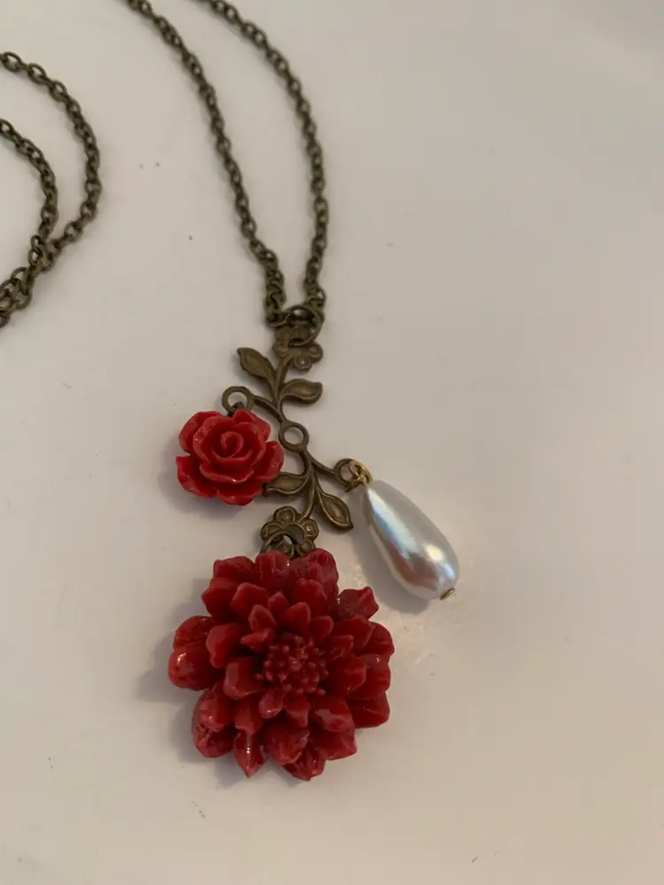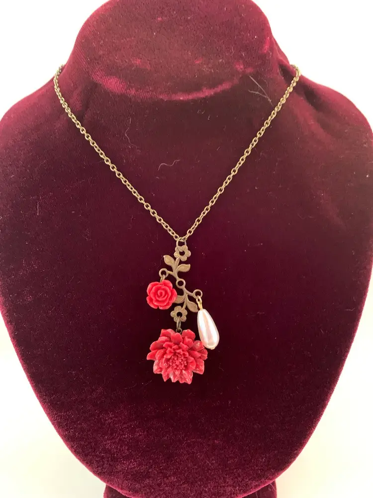Antique finish vintage floral metal piece with burgundy resin rose and mum charms and a faux pearl teardrop bead. Antique finish chain is 18 1/2” in wearable length. Beautiful romantic style piece!