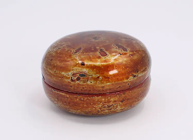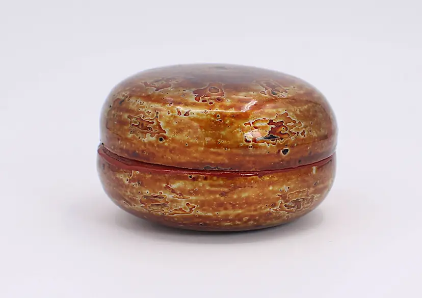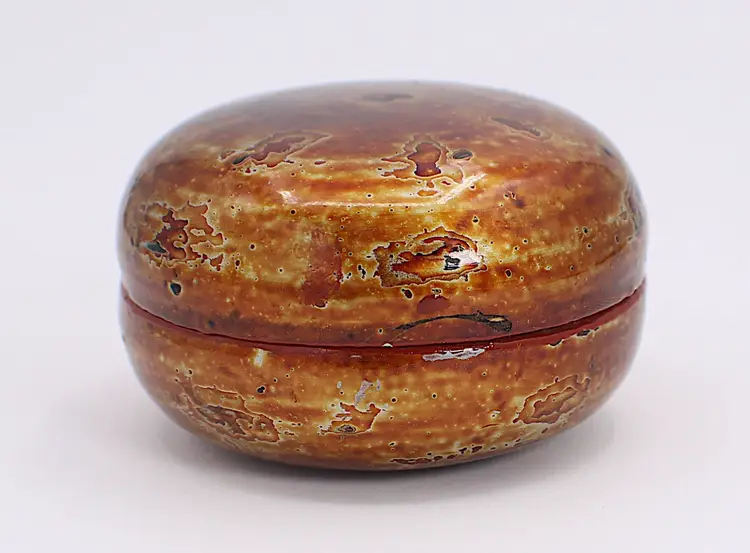 Just One Beautifully Crafted Small Burmese Lacquer Nesting Box Gold Accented Lacquerware. Measures 2.75" in diameter x 1.5" high. Stunning colors of golds, orange, brown and black.. There is a little area where the lacquered work is missing - see photos.