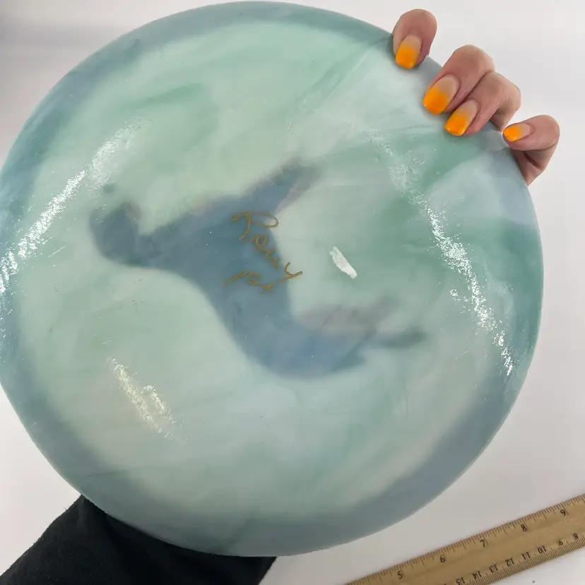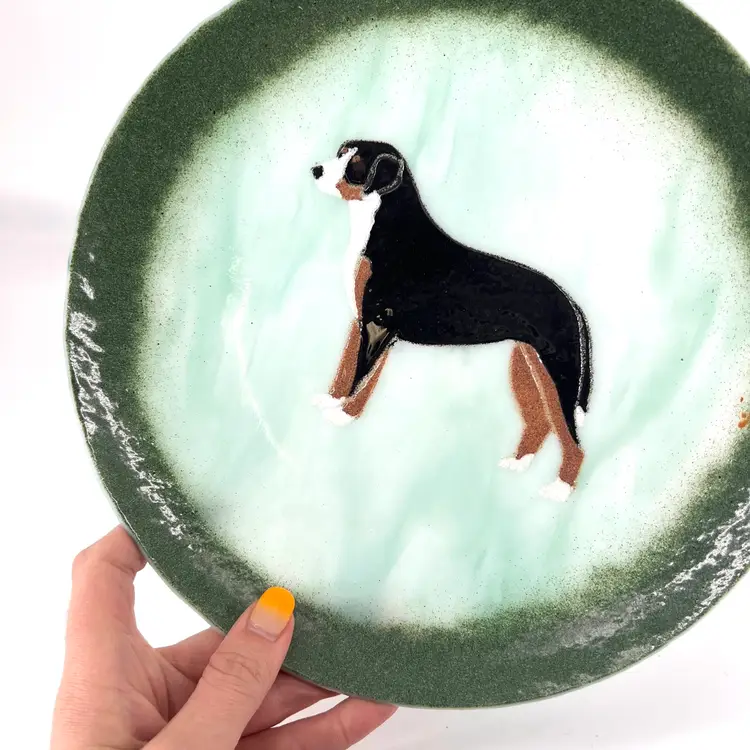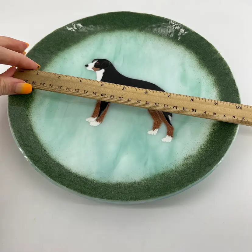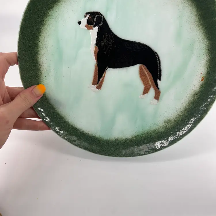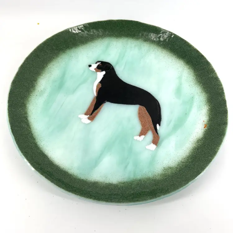 This decorative fused glass plate features a Burmese Mountain Dog. It is signed Rauy. There are no chips or cracks. It measures approx 10" in diameter.