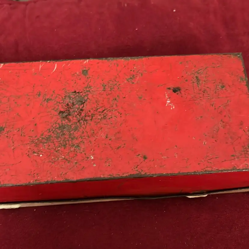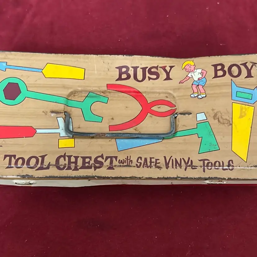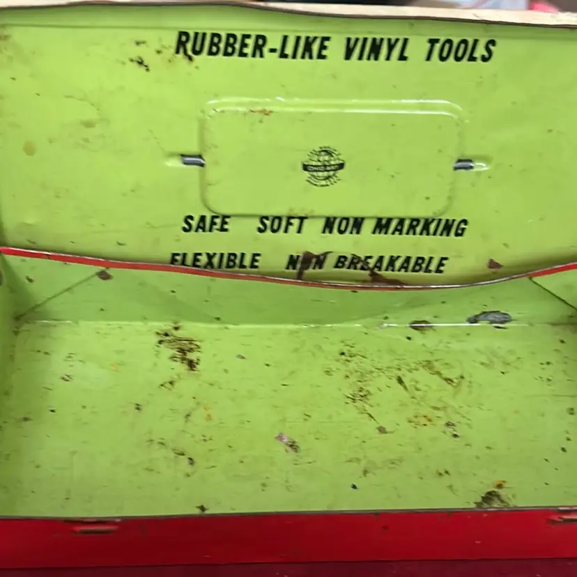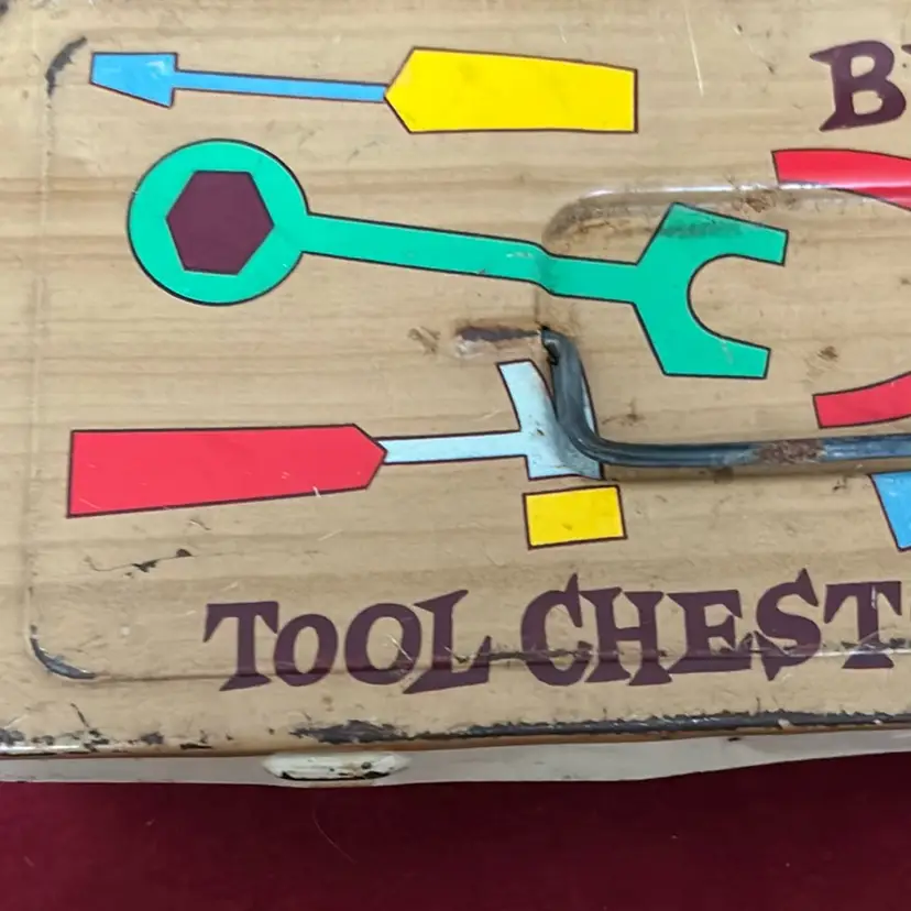 In fair shape. Does have a lot of rust inside & out due to being made of metal, No tools included.Box has been crushed on side somewhat.Made by Ohio Art. Great display piece. Measures: 8 inches across & 4 inches down.