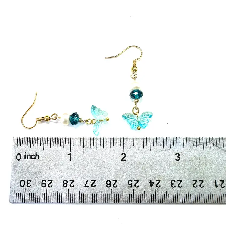Gold tone findings Features a blue glass butterfly charm with glass accent beads Approx 1.75”L Handmade by me