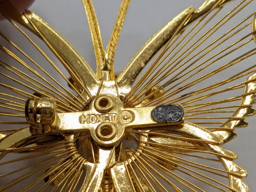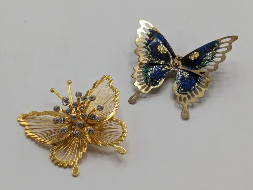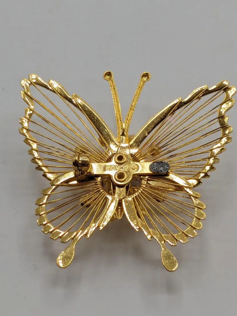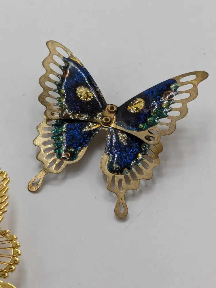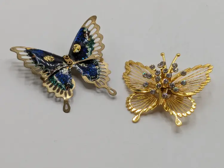 Pair of butterflies. Blue enamel pin is in good condition. READ: Gold tone with rhinestone butterfly is signed Monet but is missing the pin as you can see in the last three photos. Both butterflies measure 1 3/4" wide and 1 3/4" in length.
