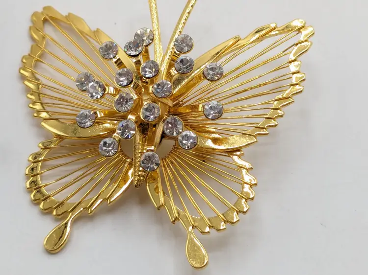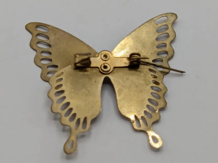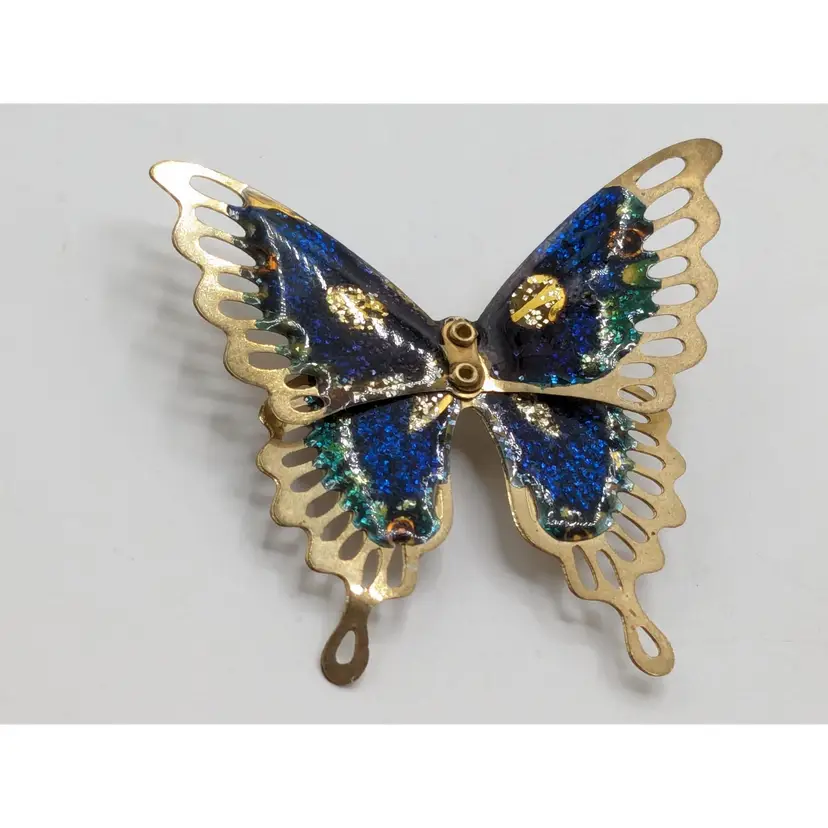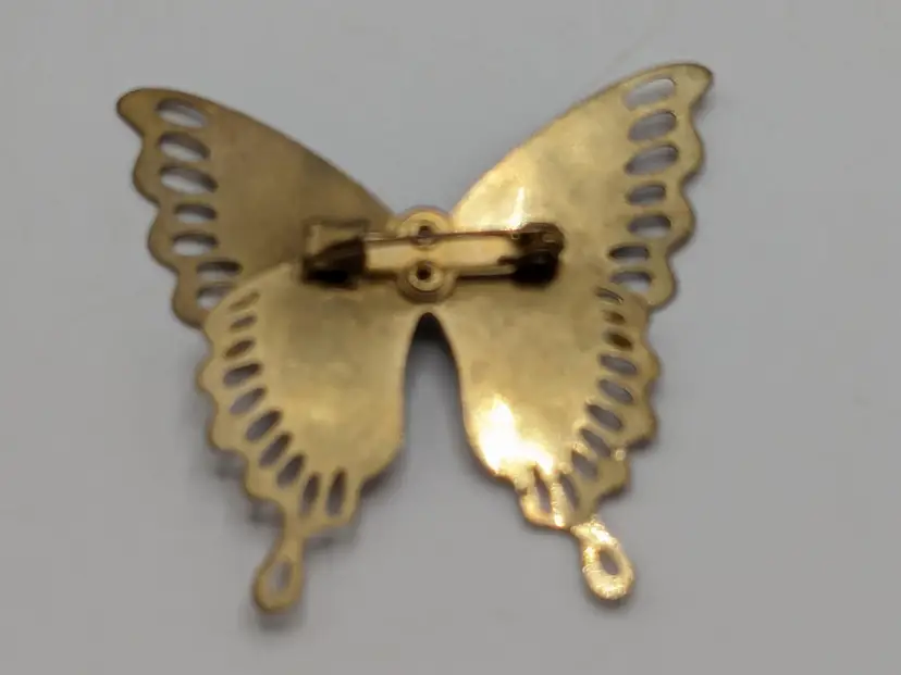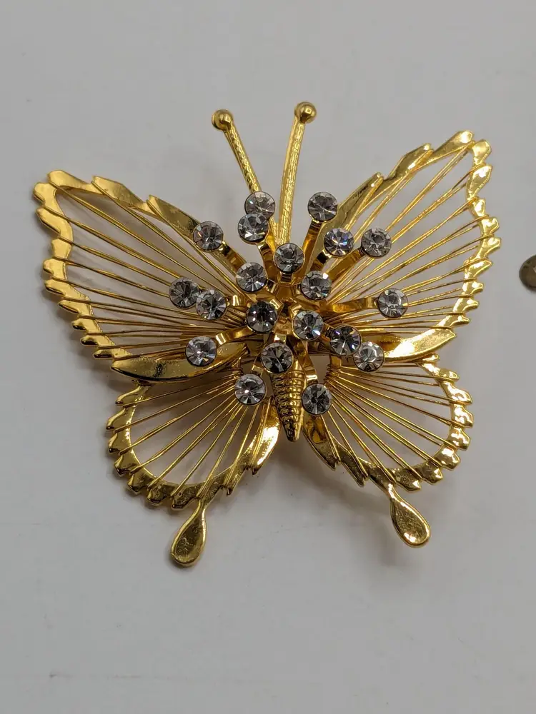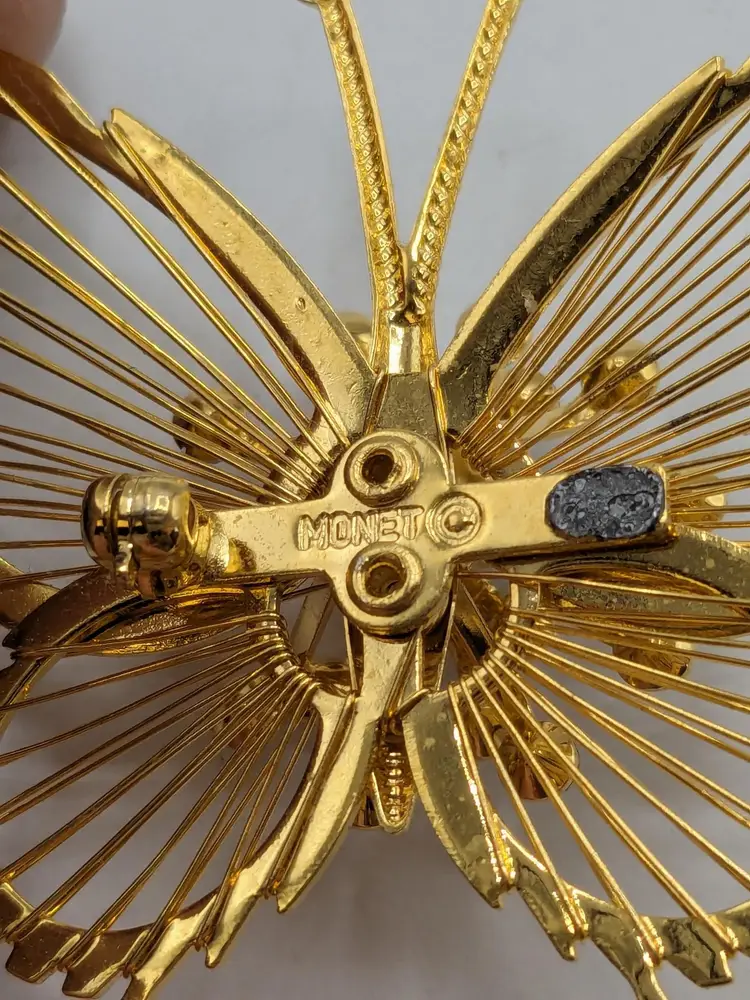 Pair of butterflies. Blue enamel pin is in good condition. READ: Gold tone with rhinestone butterfly is signed Monet but is missing the pin as you can see in the last three photos. Both butterflies measure 1 3/4" wide and 1 3/4" in length.