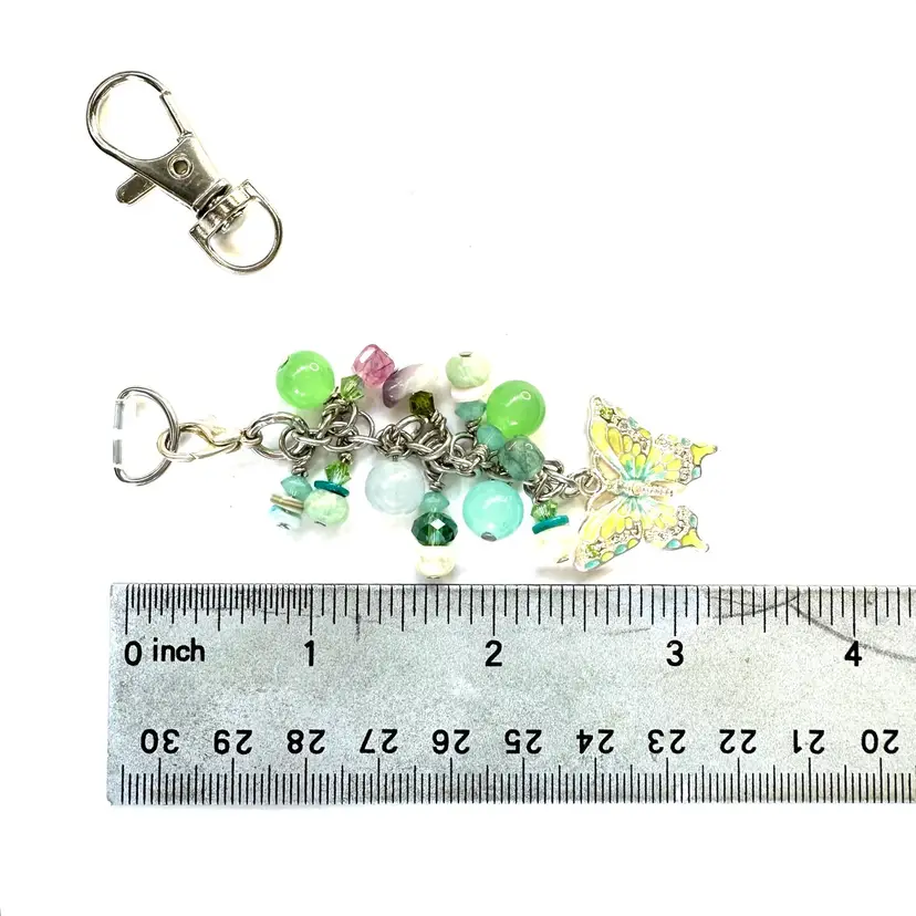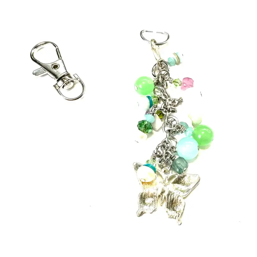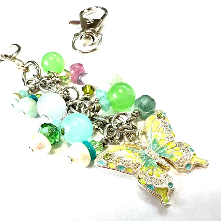 Features a silver tone butterfly charm and other various shades of blue and green beads made of glass and stone Silver tone findings Cell phone charm holder which fits between the phone and the case Also includes a swivel hook for optional use as a purse charm Lobster clasp allows for quick and easy removal when needed without removing case Made by me with repurposed jewelry pieces
