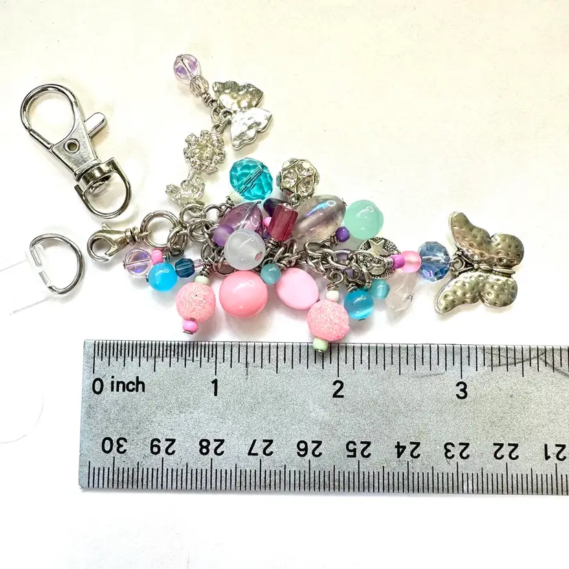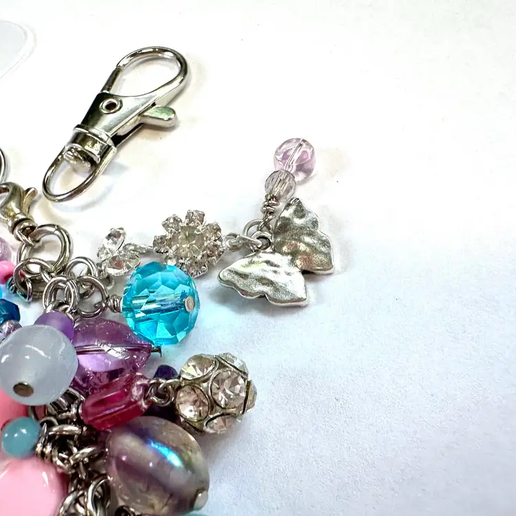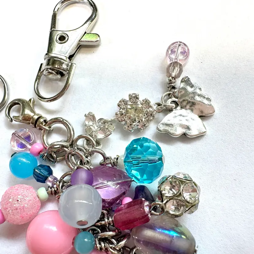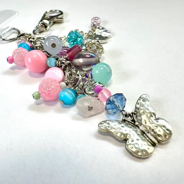 Features two silver tone butterfly charms and other various shades of blue, pink, and purple beads made of glass and acrylic Silver tone findings Cell phone charm holder which fits between the phone and the case included Also includes a swivel hook for optional use as a purse charm Lobster clasp allows for quick and easy removal when needed without removing case Made by me with repurposed jewelry pieces