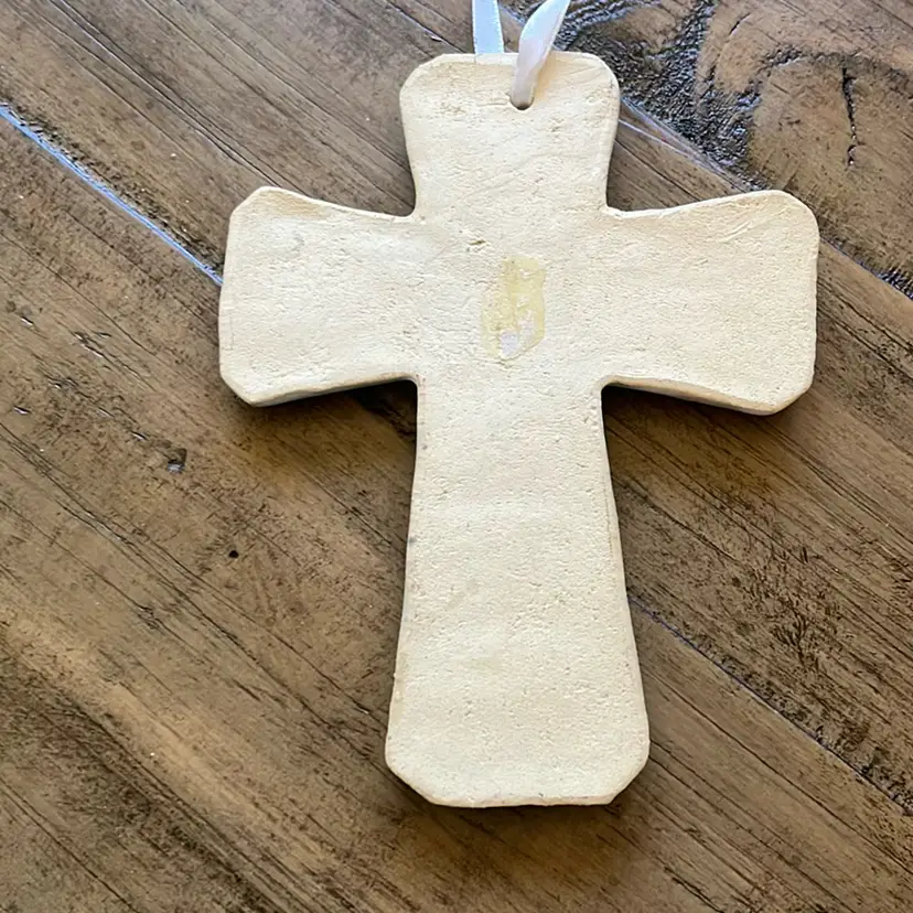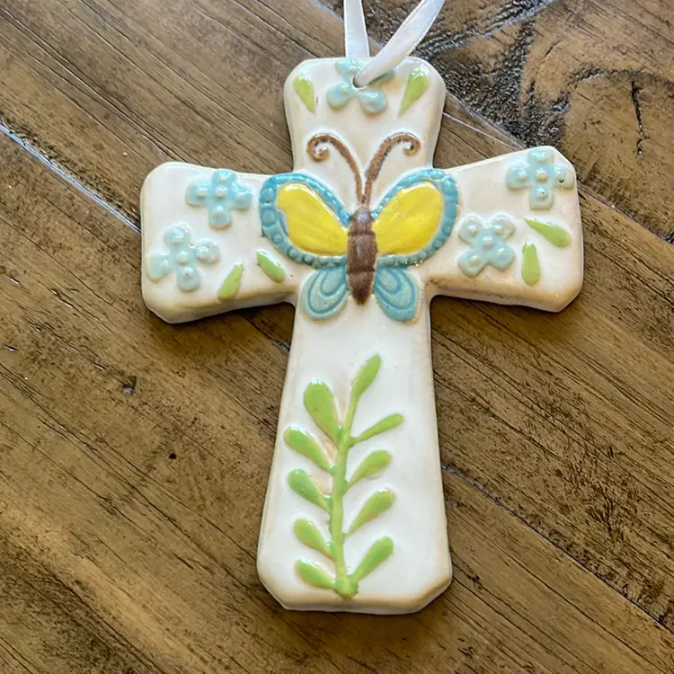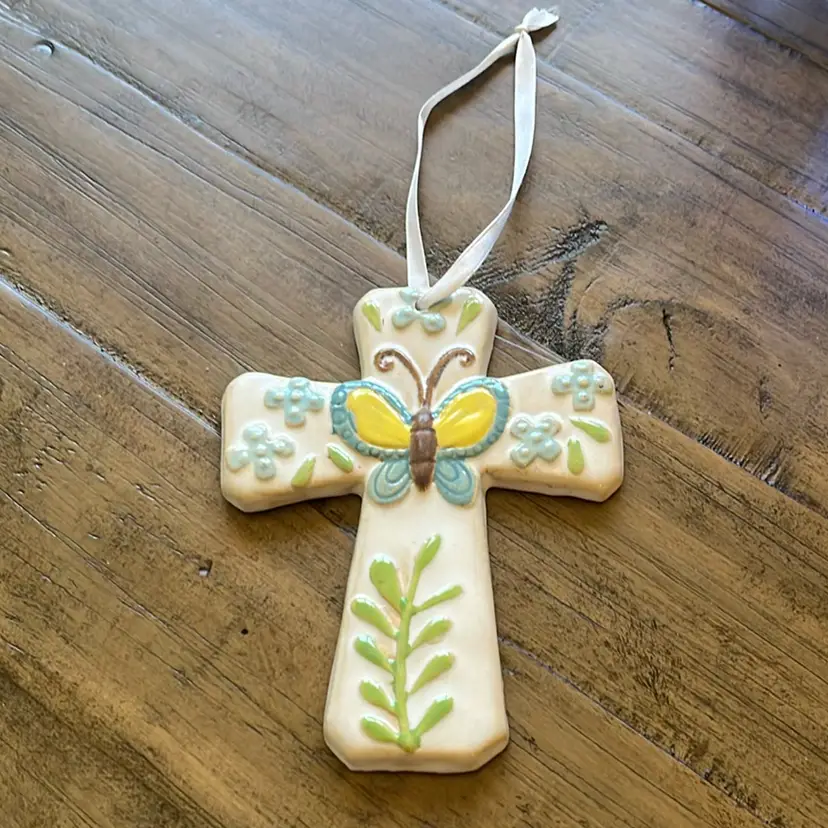 Pretty ceramic butterfly cross ready to hang Measures 5 3/4” tall by 4 1/2” wide