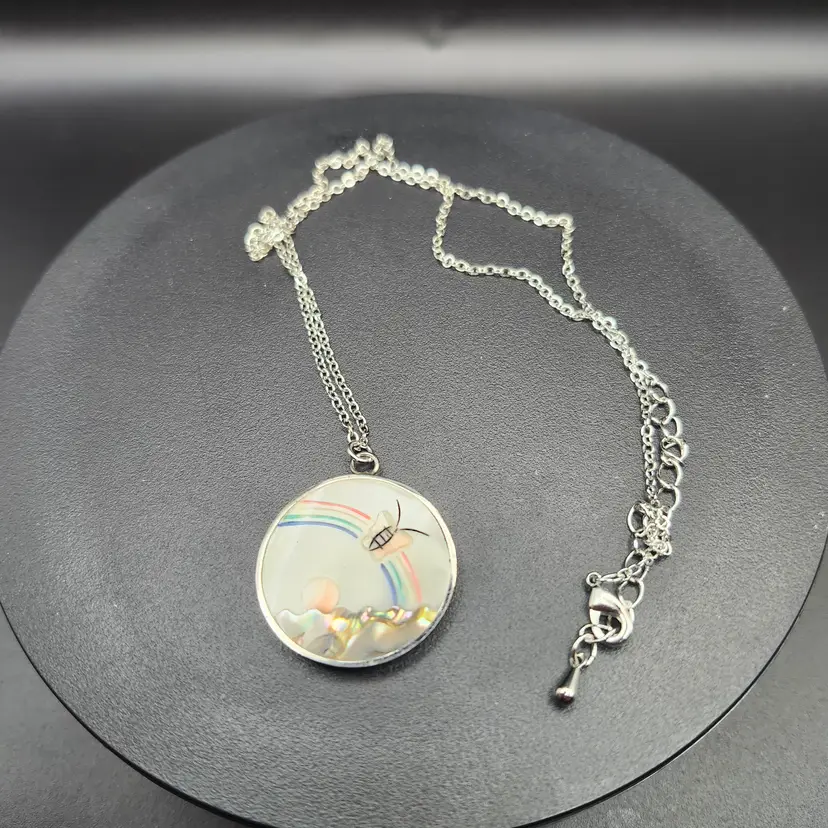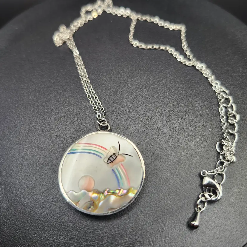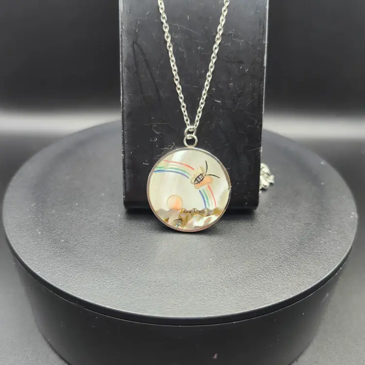 Embrace whimsical charm with the Butterfly Dreams Pendant Necklace. This piece features a delicate butterfly design set against a dreamy, multicolored background. The silver-tone chain adds a touch of elegance, making it perfect for everyday wear or special occasions. Let your style take flight with this enchanting accessory. Vintage Rainbow Butterfly Necklace - Genuine mother of pearl