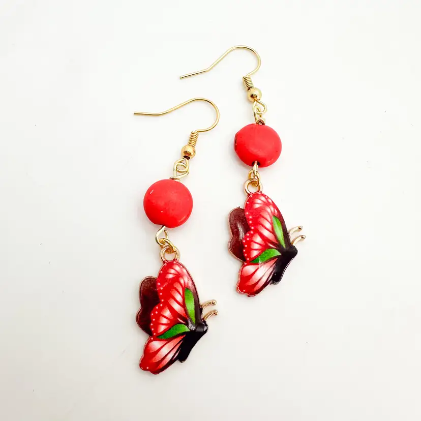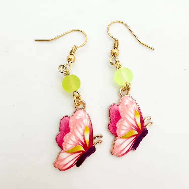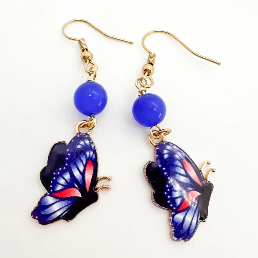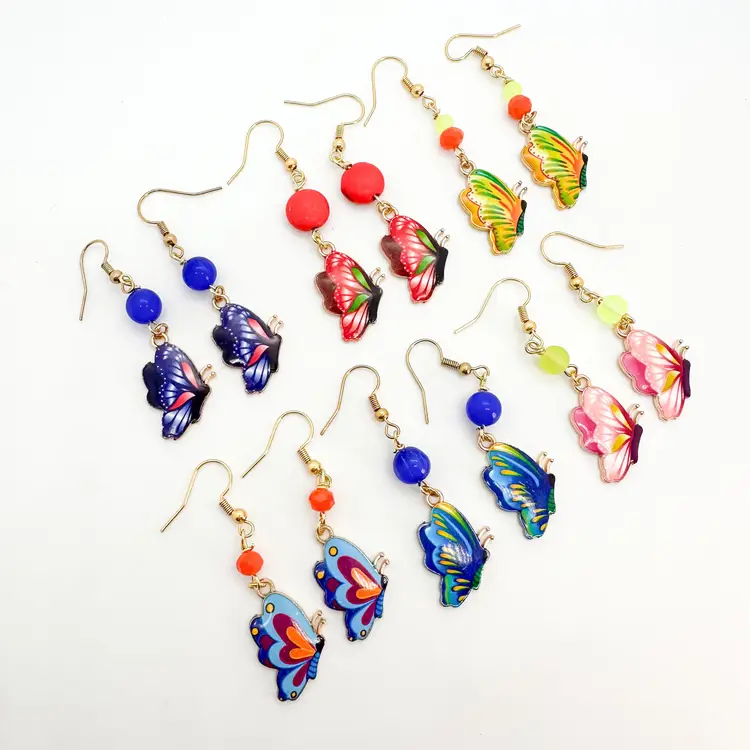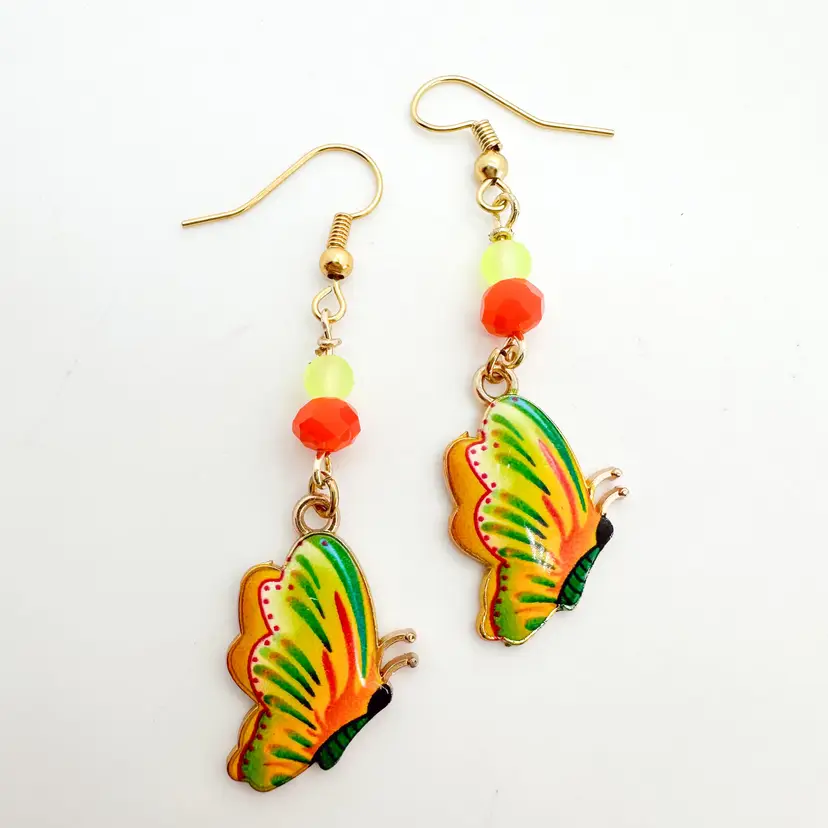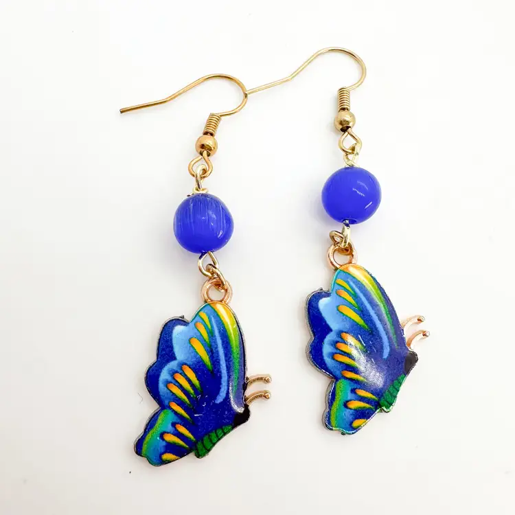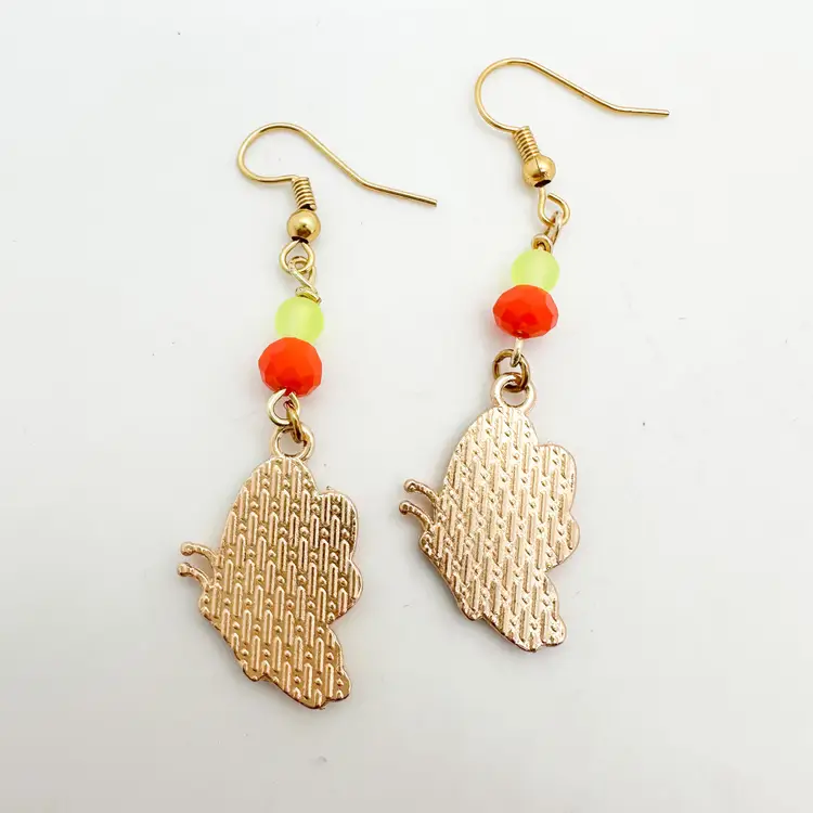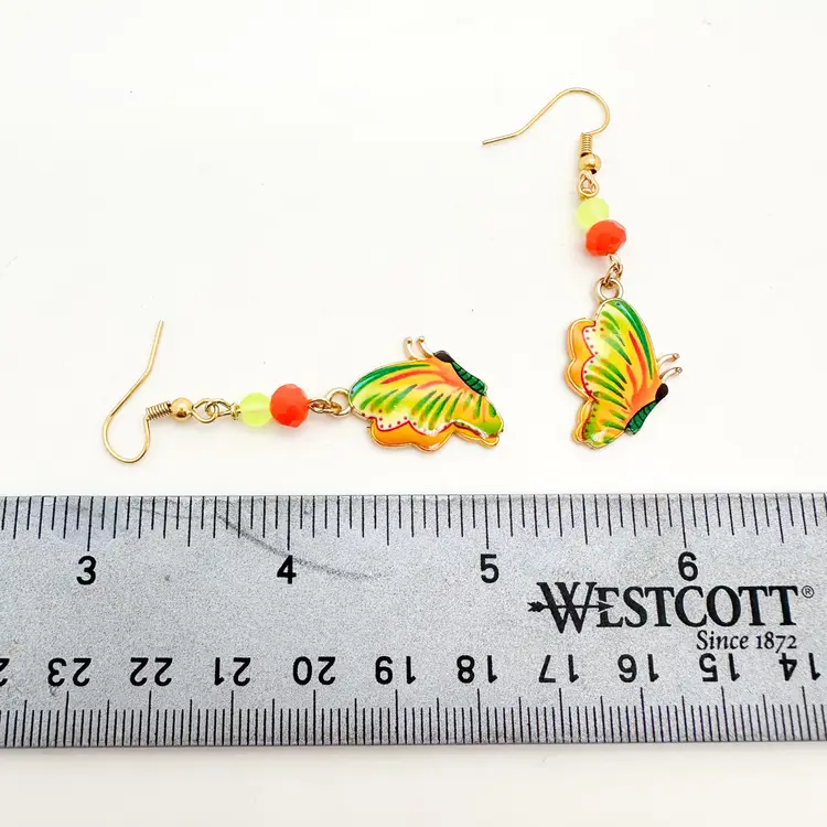 Butterfly earrings Various bright colors Bead accent Gold tone Fish hook wire Approximately 2" L
