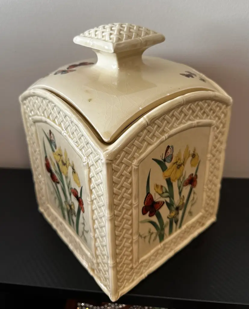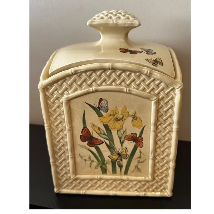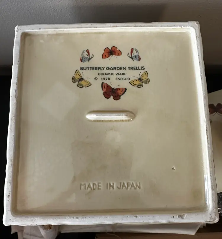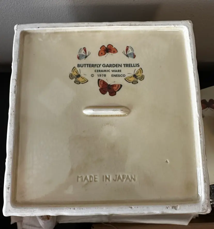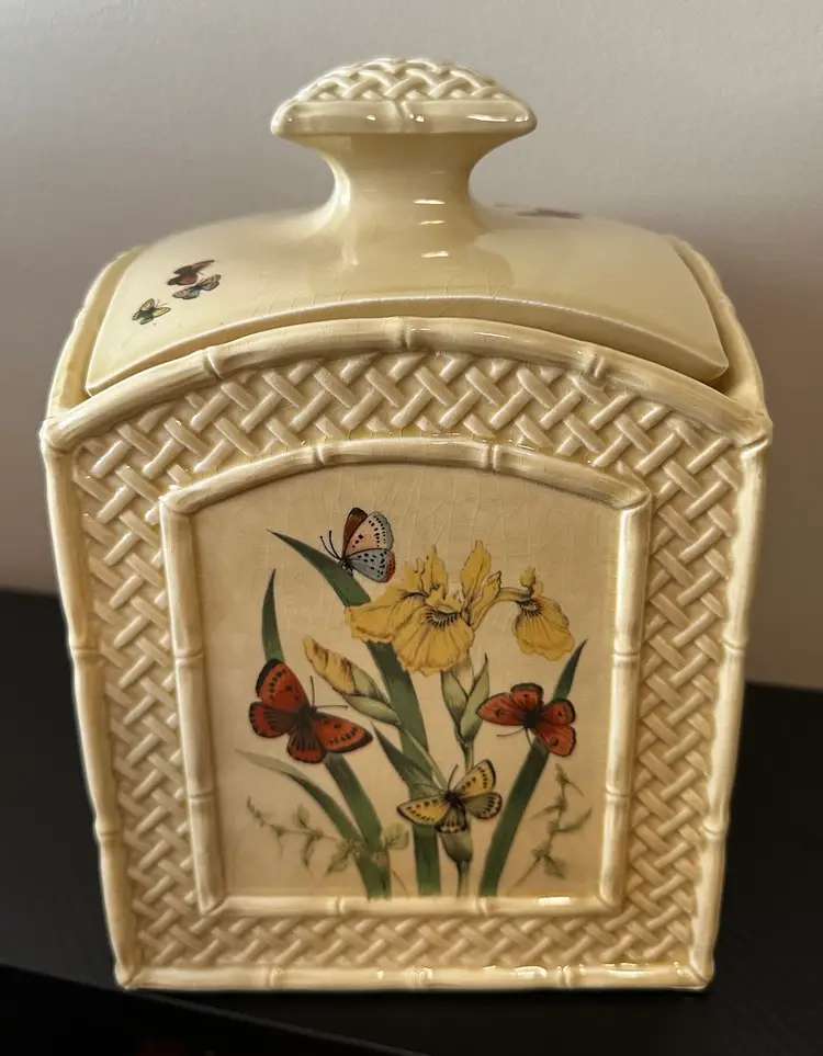 Beautiful Butterfly ceramic canister. Made in Japan. 6 inch square, 9 inches tall with lid. Normal crazing for age. Bottom canister is in wonderful condition, lid has a few call outs in pictures - couple flea bite chips and dark spot on top of lid and a few chips on bottom of lid.