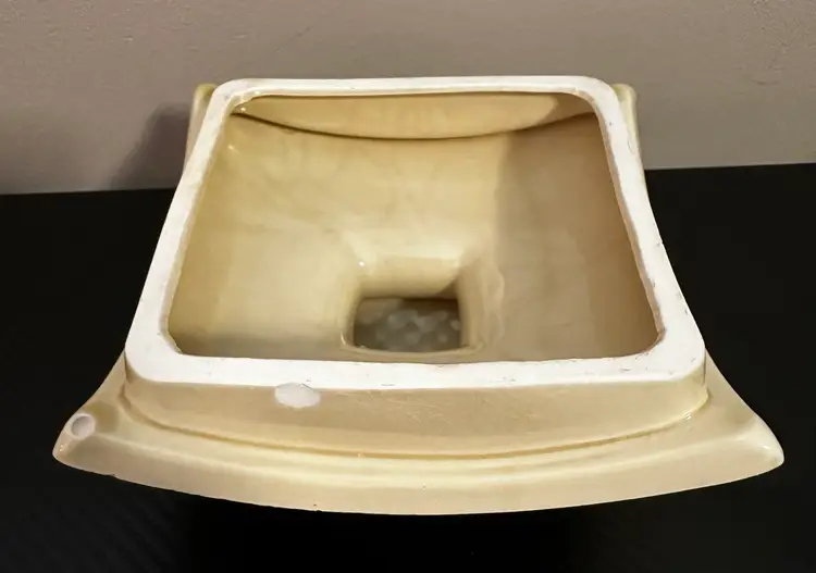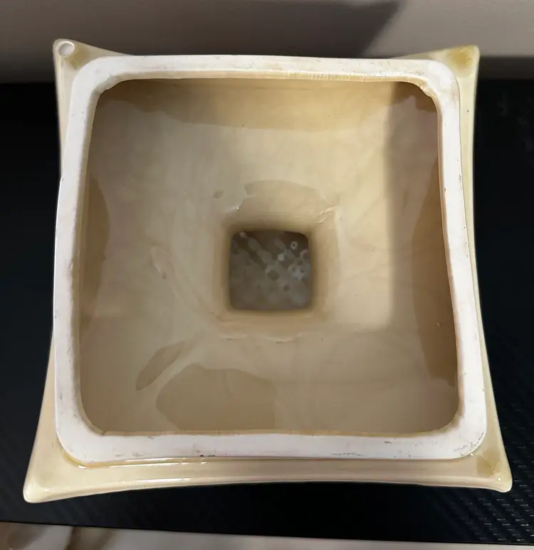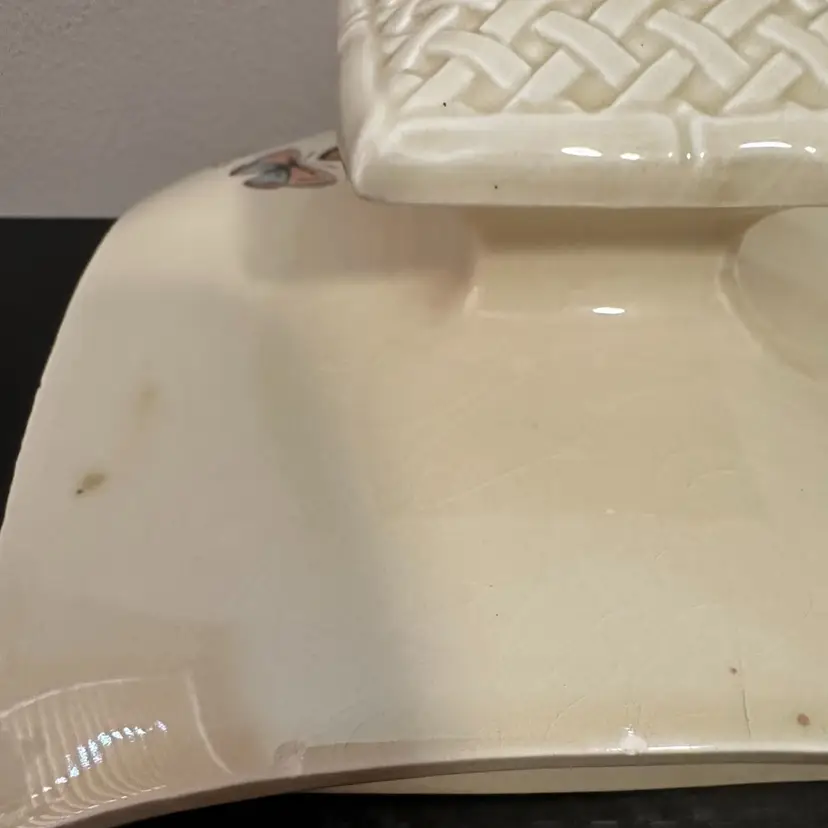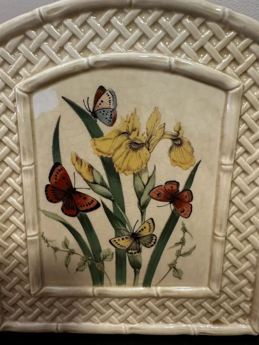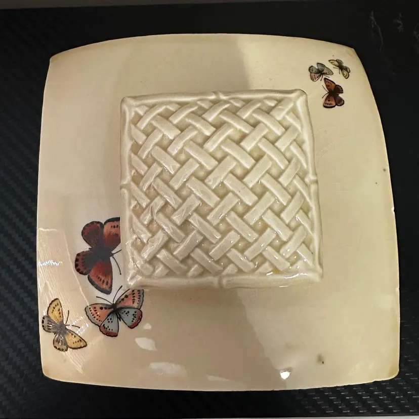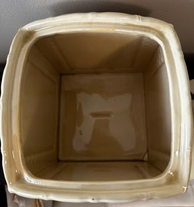 Beautiful Butterfly ceramic canister. Made in Japan. 6 inch square, 9 inches tall with lid. Normal crazing for age. Bottom canister is in wonderful condition, lid has a few call outs in pictures - couple flea bite chips and dark spot on top of lid and a few chips on bottom of lid.