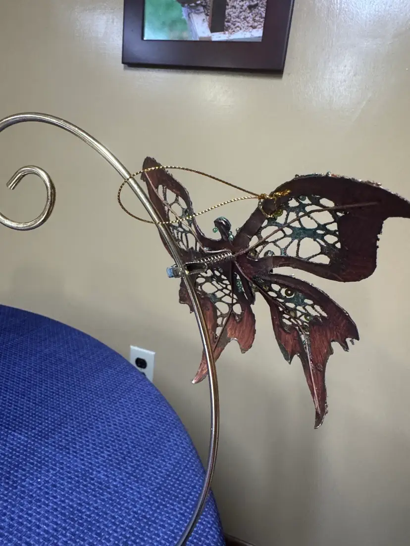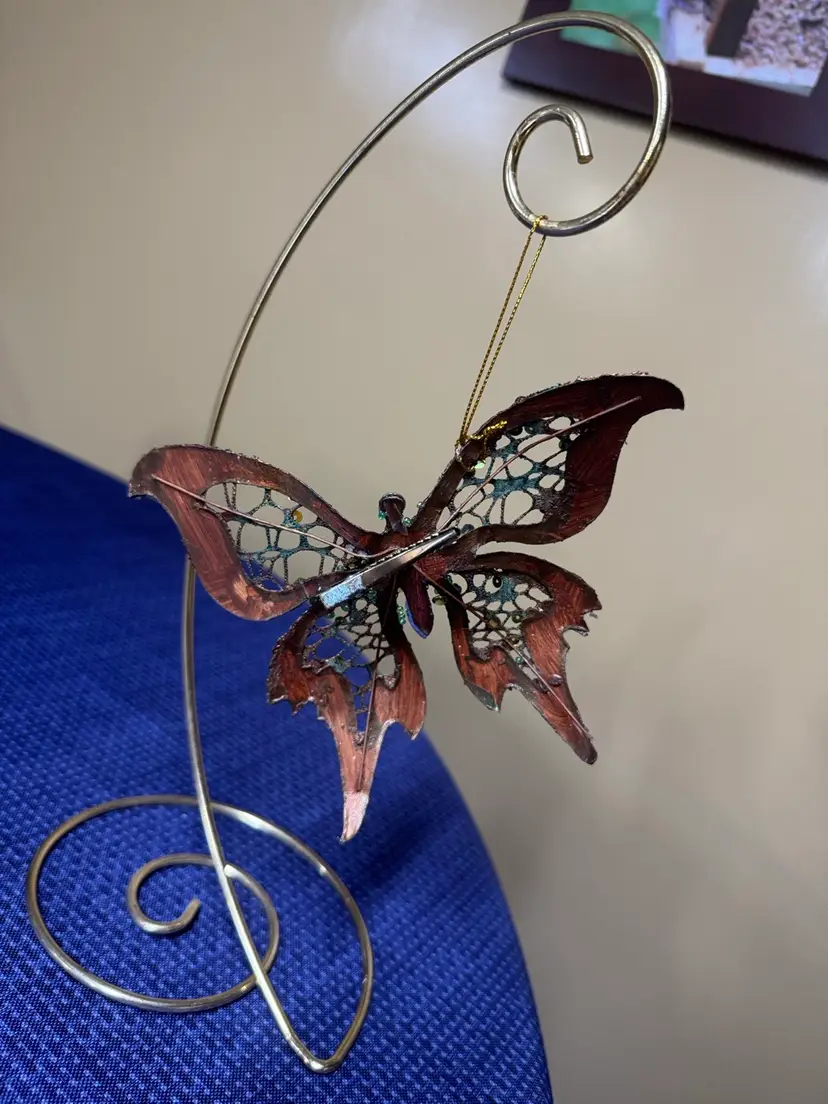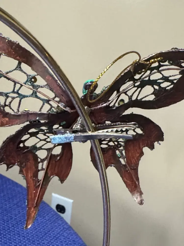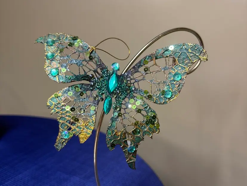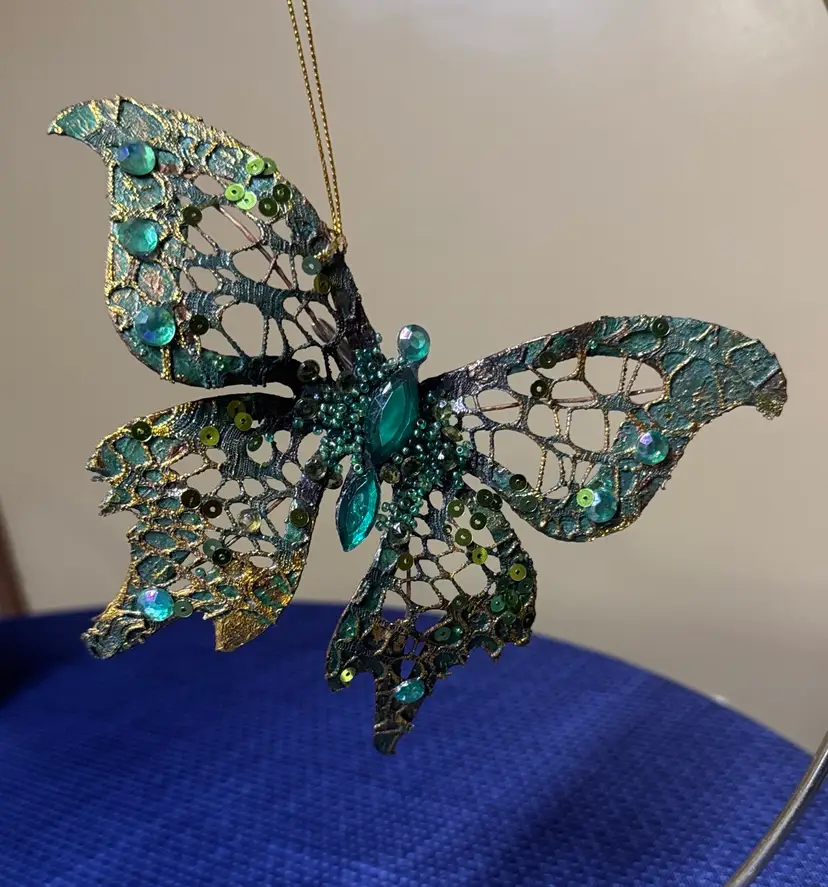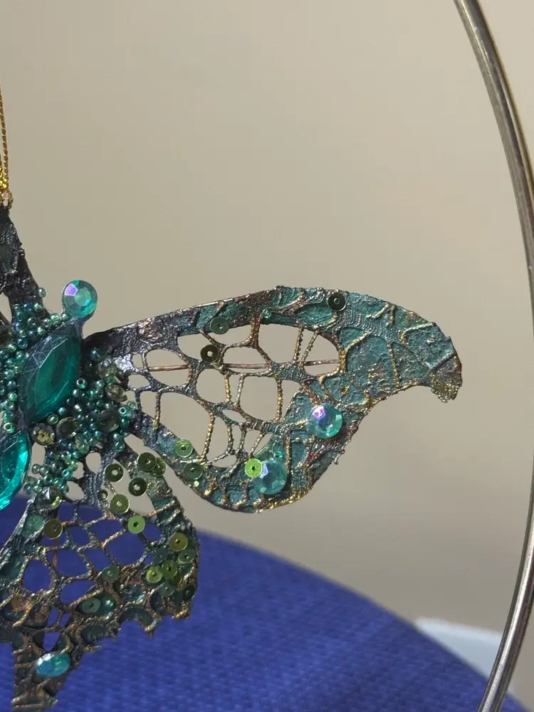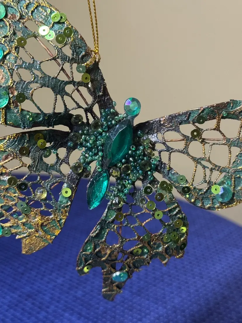 Elegant butterfly ornament with intricate green and gold detailing. Perfect for decoration. butterfly ornament, likely from the 1970s, featuring a detailed design with sequins rhinestones gold and beads Hang with gold hanger or chip Excellent condition (101392325a)