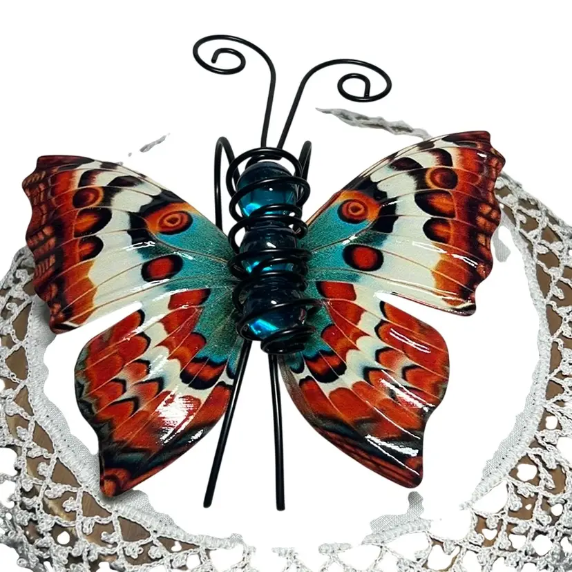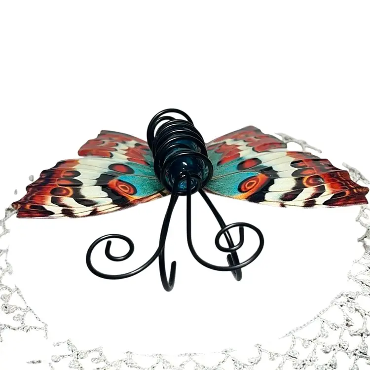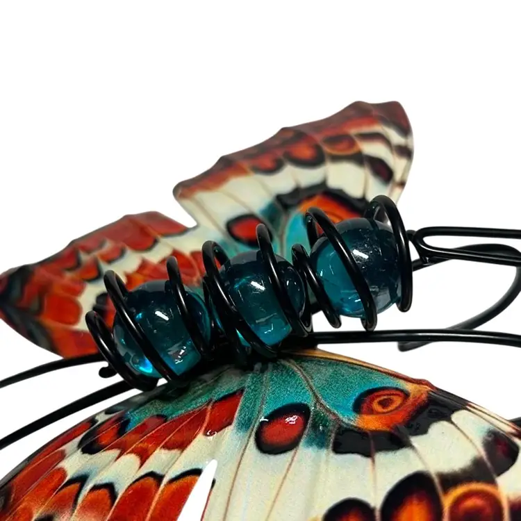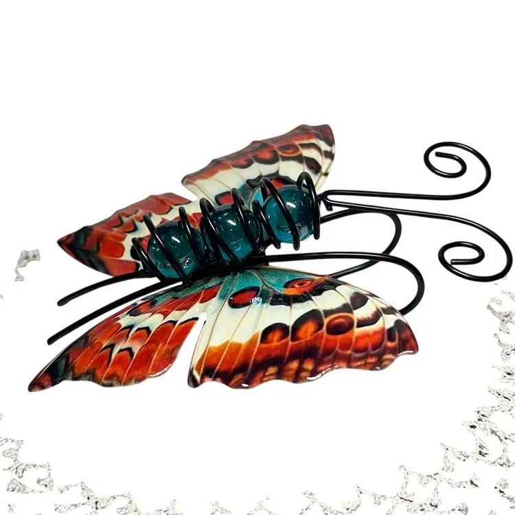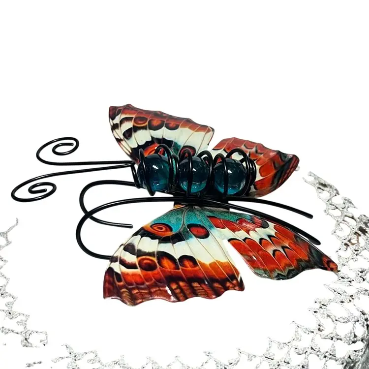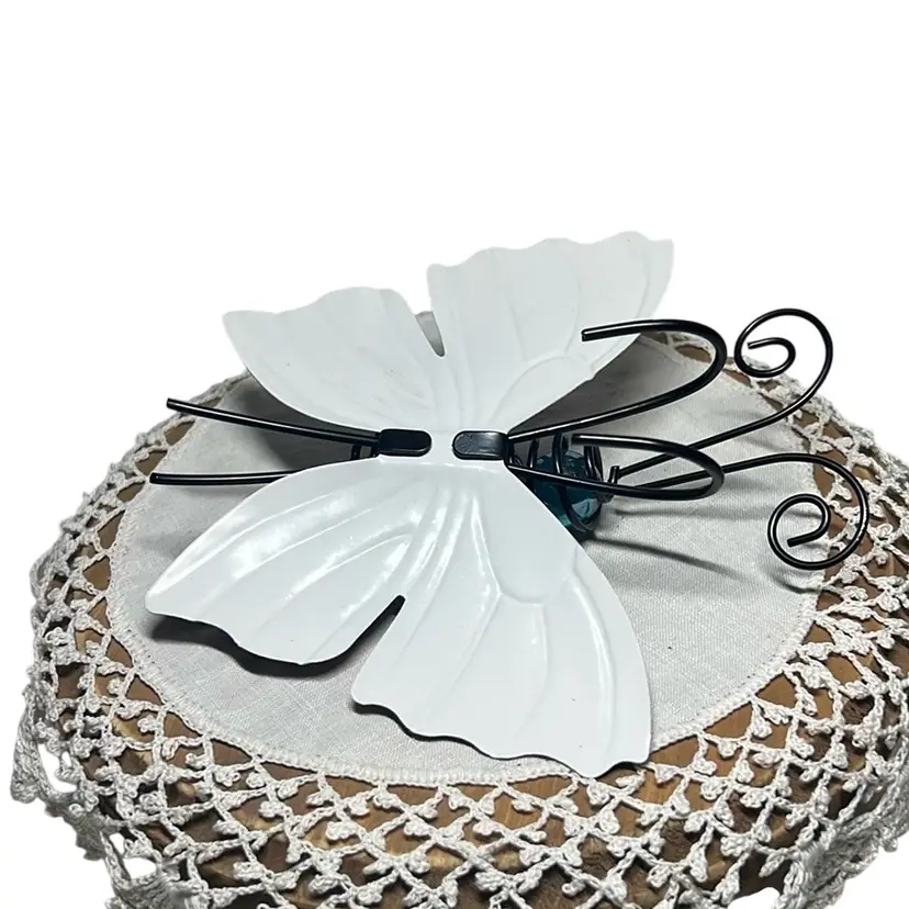 Made of metal with scrolled metal body and 3 light blue marbles. No damage measures 5.5” long & 5.5” wide