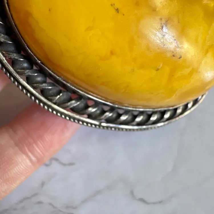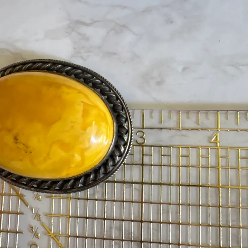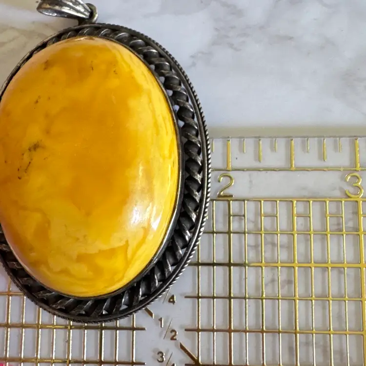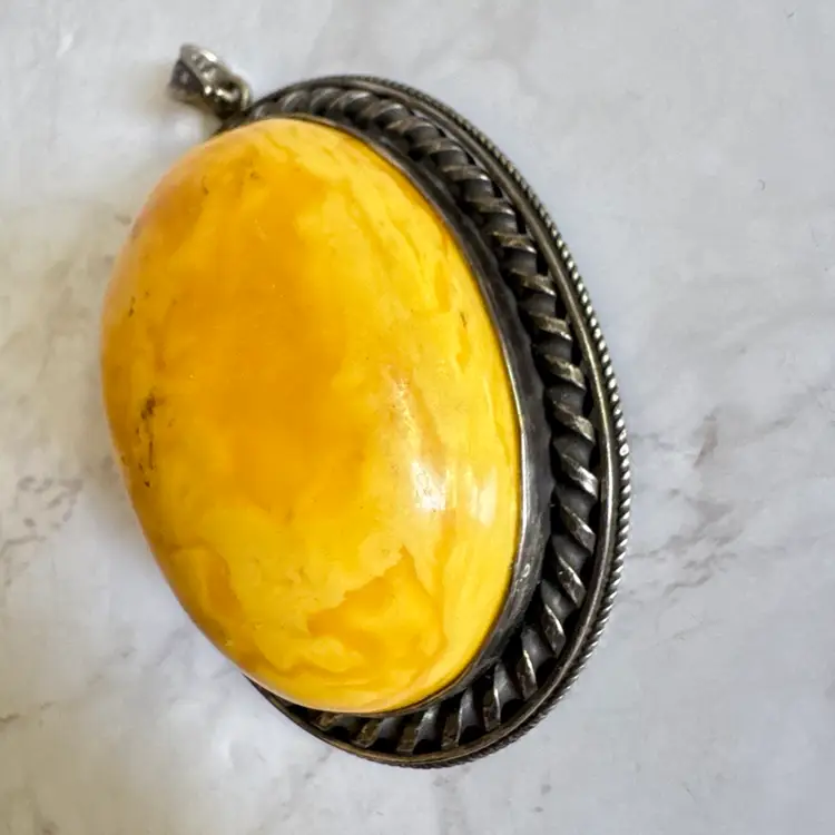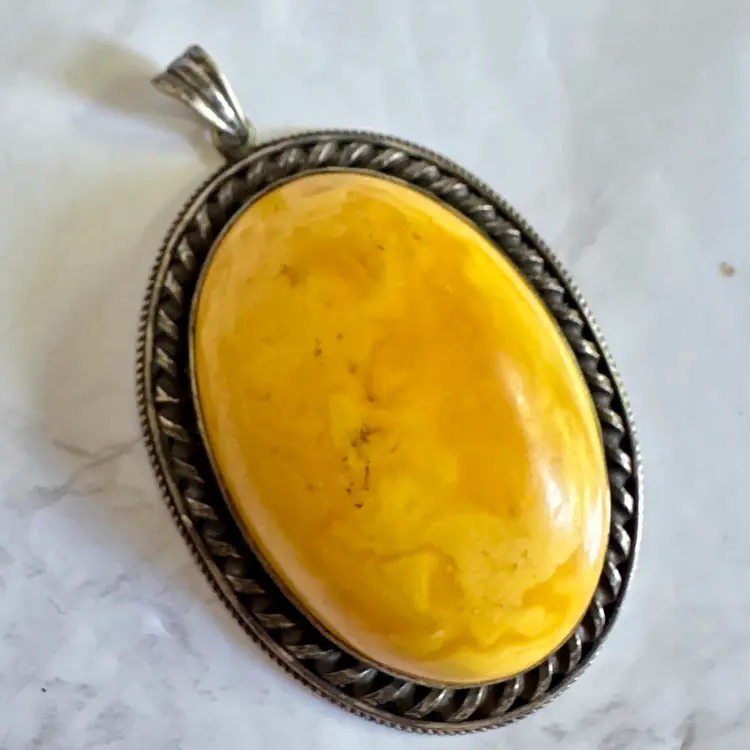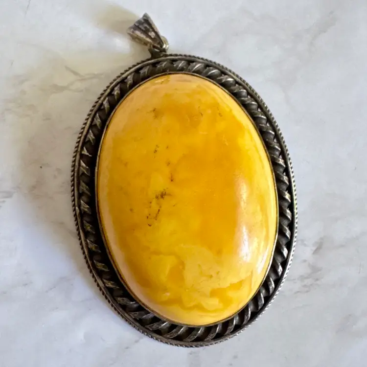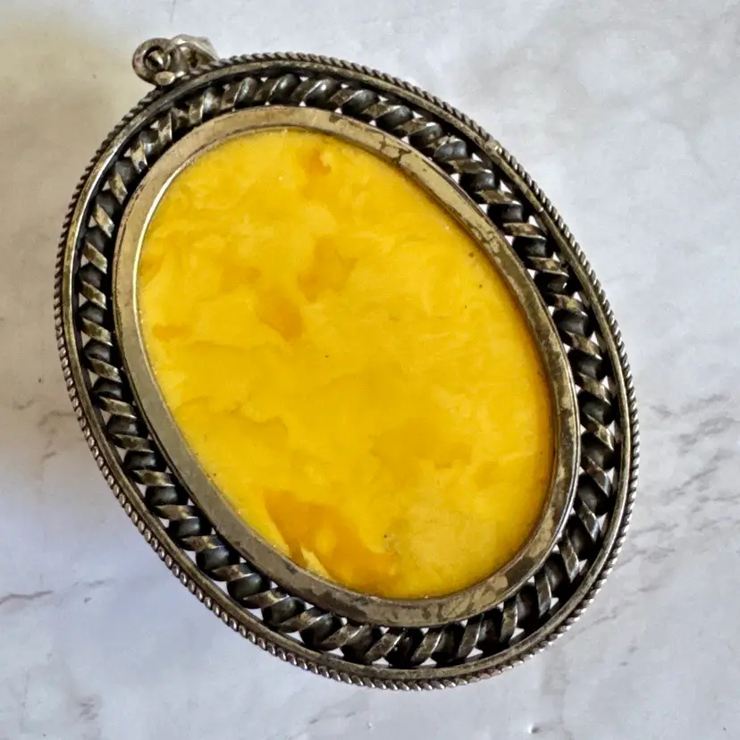 This elegant vintage pendant showcases a large oval butterscotch amber cabochon with warm yellow marbling and a waxy luster, set in a sterling silver frame with a classic twisted rope border for added texture and detail. Amber, often sourced from Baltic regions, symbolizes healing, protection, and positive energy in various cultural traditions, making this piece a meaningful accessory. Likely handcrafted in the mid-20th century or earlier, it reflects Eastern European or Baltic jewelry styles, perfect for collectors or those seeking a timeless, boho-inspired necklace focal point.