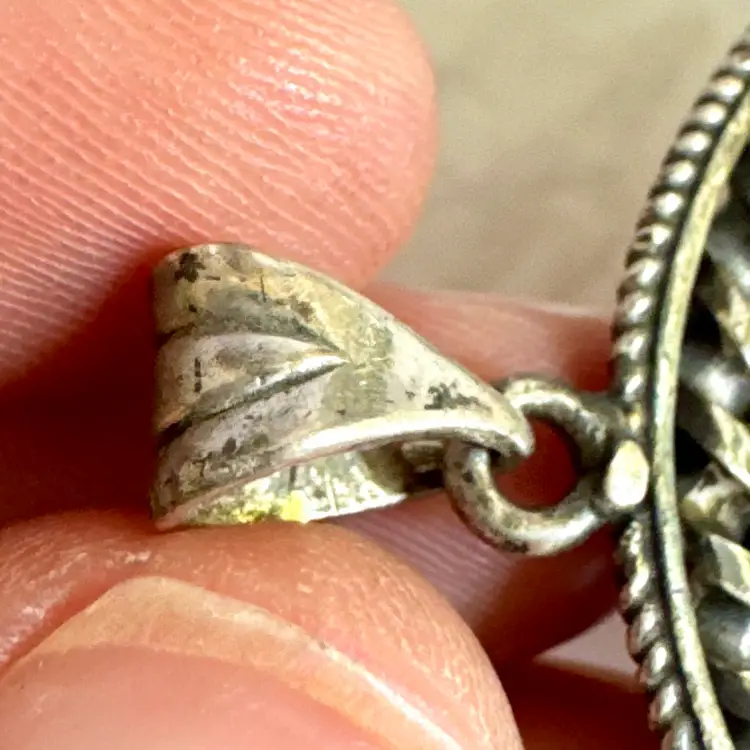 Tested as sterling silver or higher. Good condition with signs of wear due to age. Stone can have natural inclusions and flaws. 2-7/8”h x 1-7/8”w. Weighs 42g.