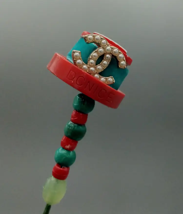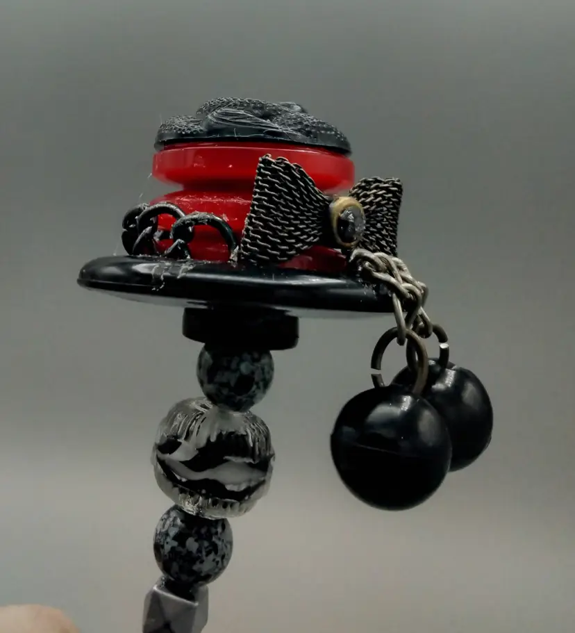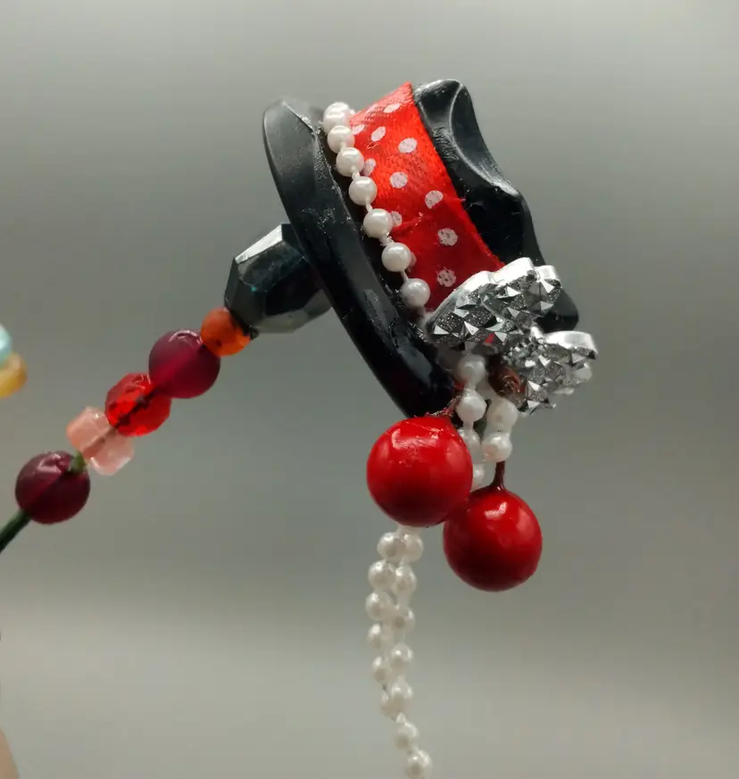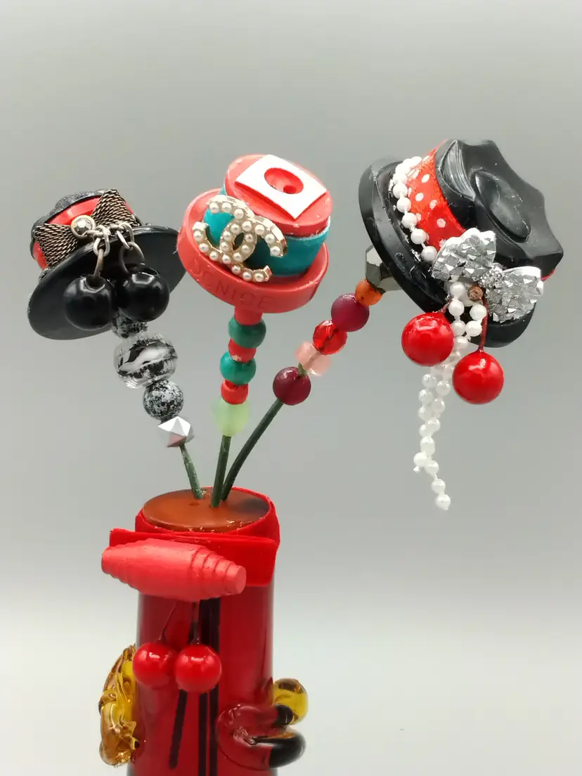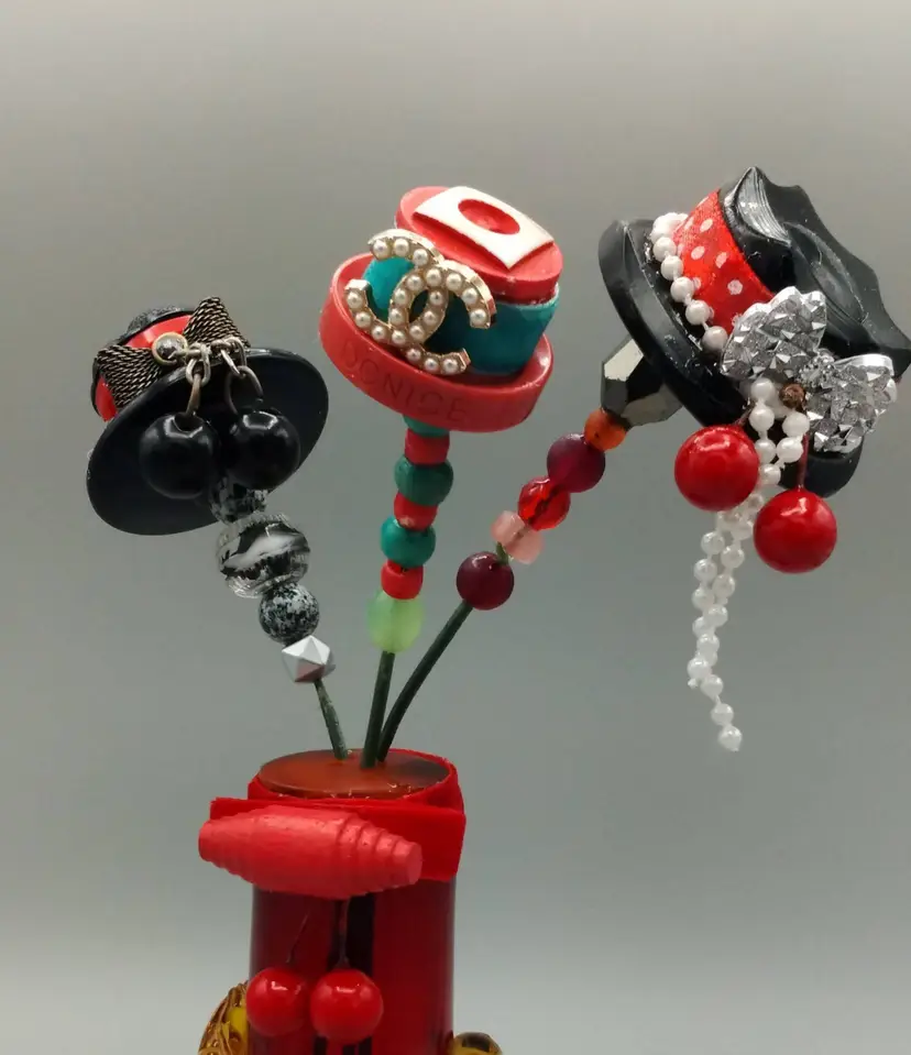 Button Hat, Hat Pins. A set Of Three. Red Themed. Vintage Buttons are used to create what I feel look like tiny hats, then mounted on a floral pic with co-ordinated beads, making a button Hat, Hat pins. They are placed into a red tube vase with amber colored applied handles that glow under UV light. A wood button with two balls make a bow on the vase.