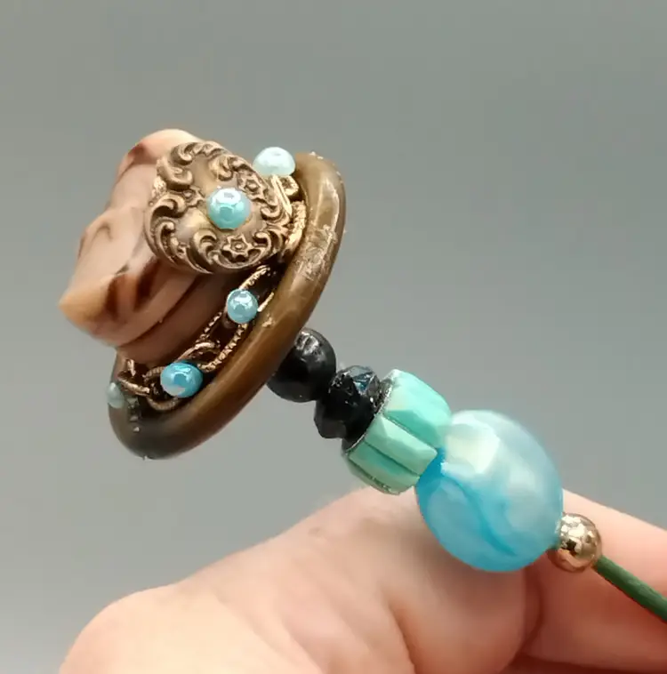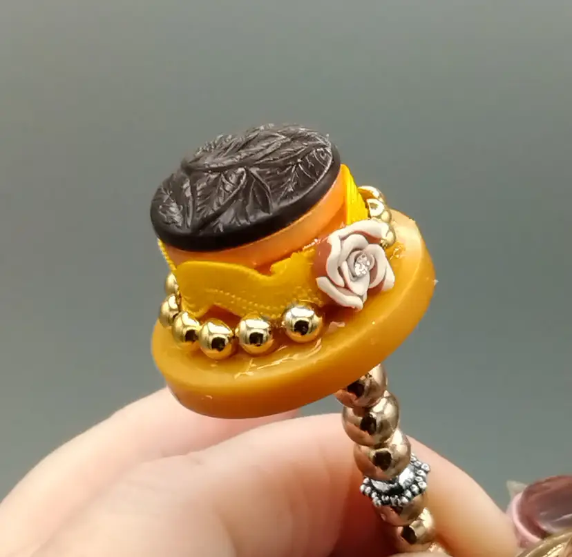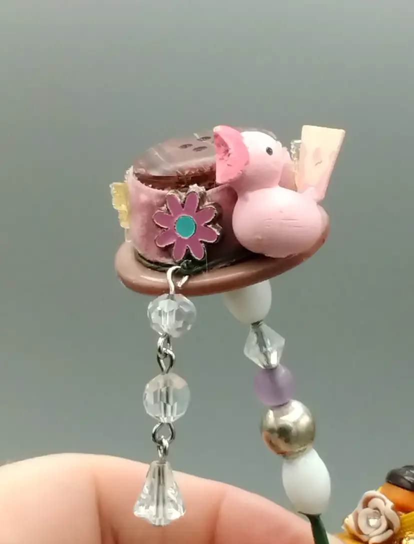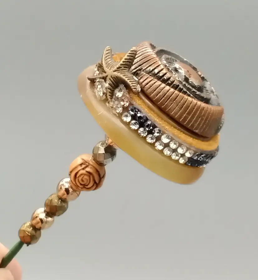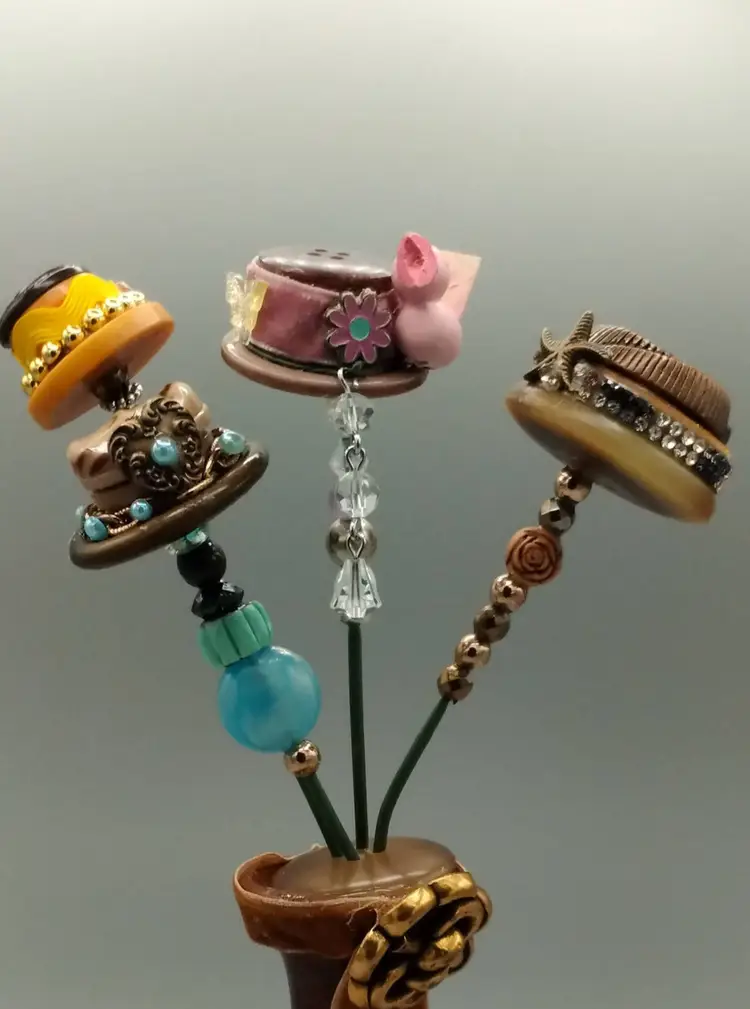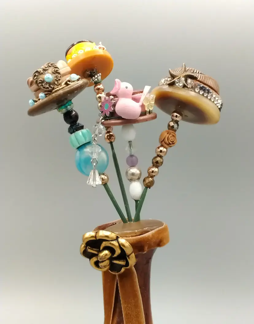 Button Hat, Hat Pins. A SET of Four Hats Made From Vintage Buttons. ADORN with found items and vintage jewelry pieces, all set on a floral pic with co-ordinated beads. THE VASE is a ceramic vase with a wood tone finish, as well as a ribbon and a button for a bow.