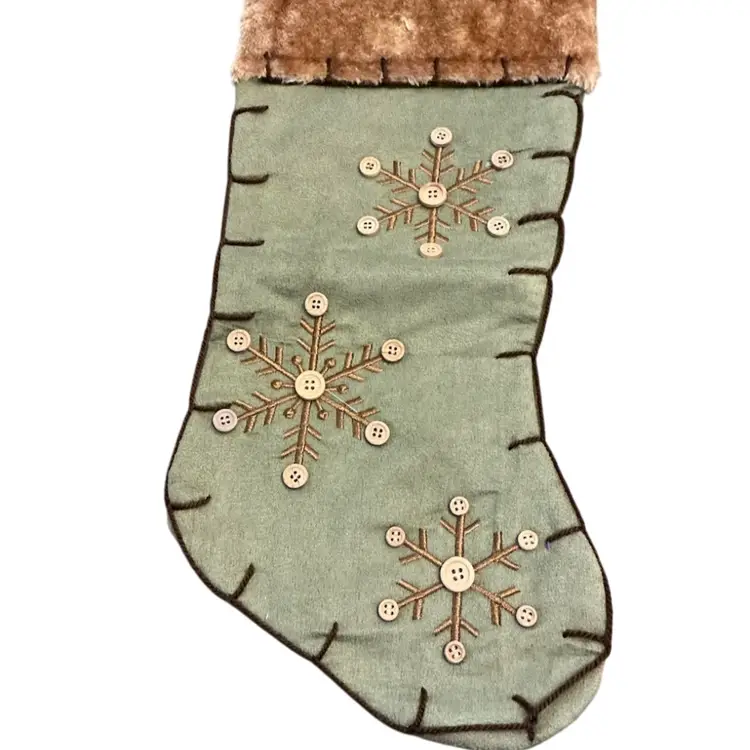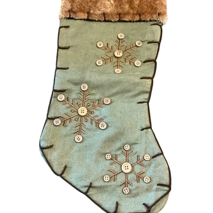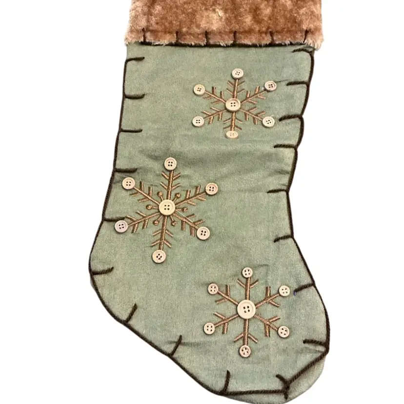Felt stocking on outside and lined inside. Cute snowflake design using buttons. Hangs 17 1/2” and is 9” in widest point.