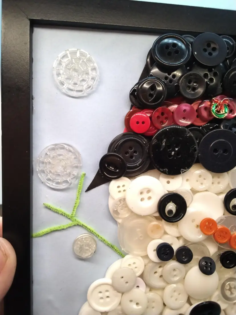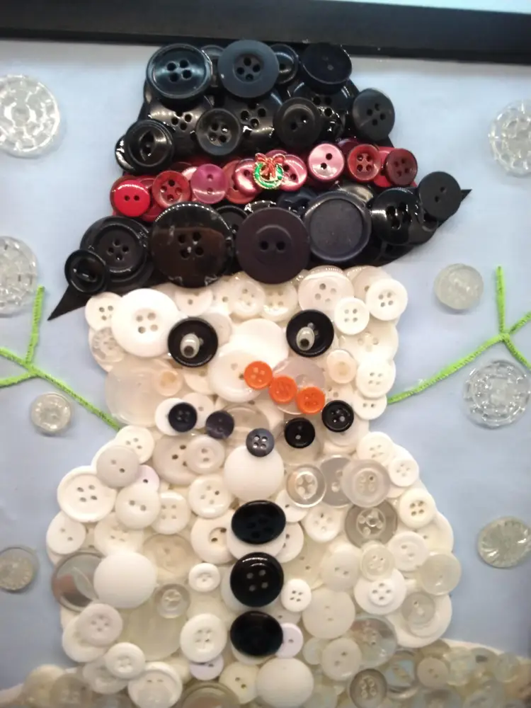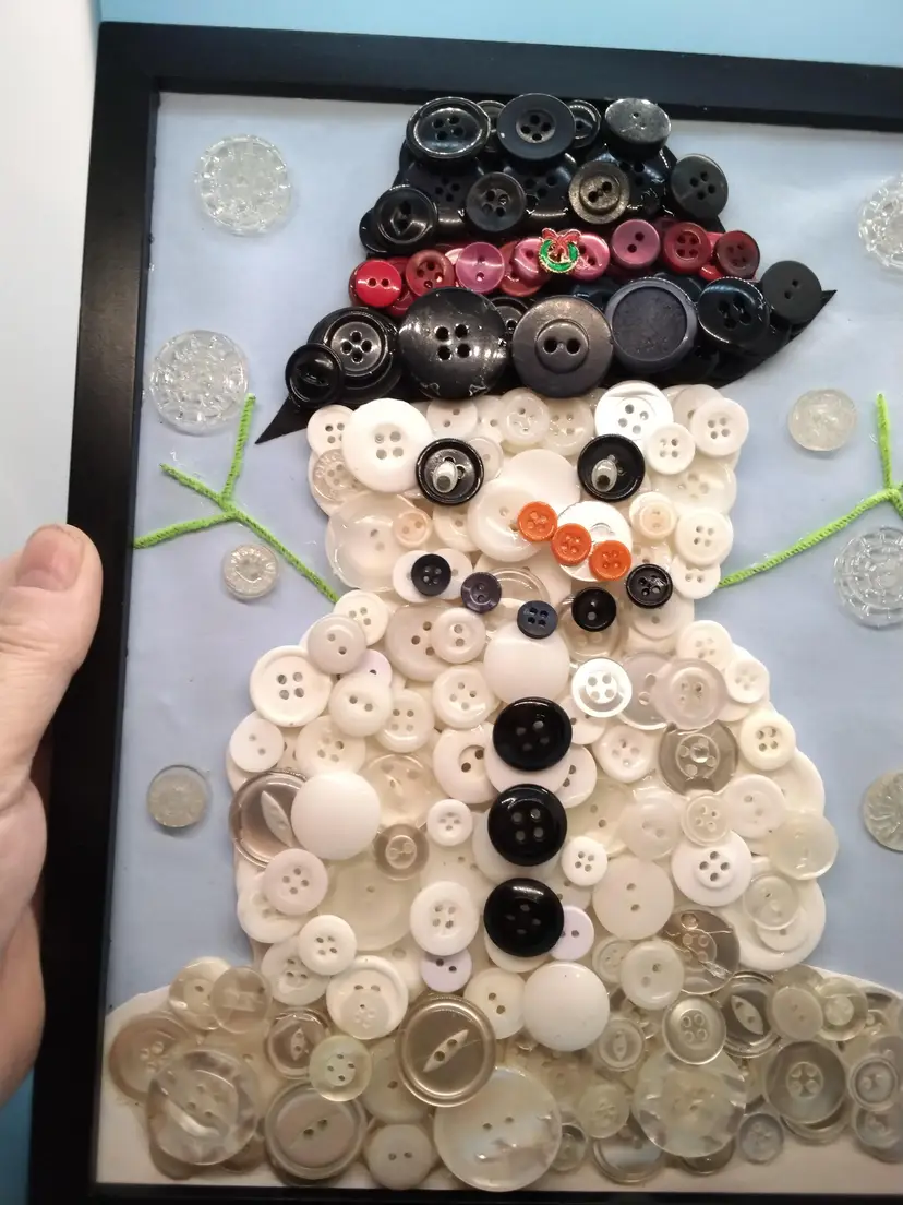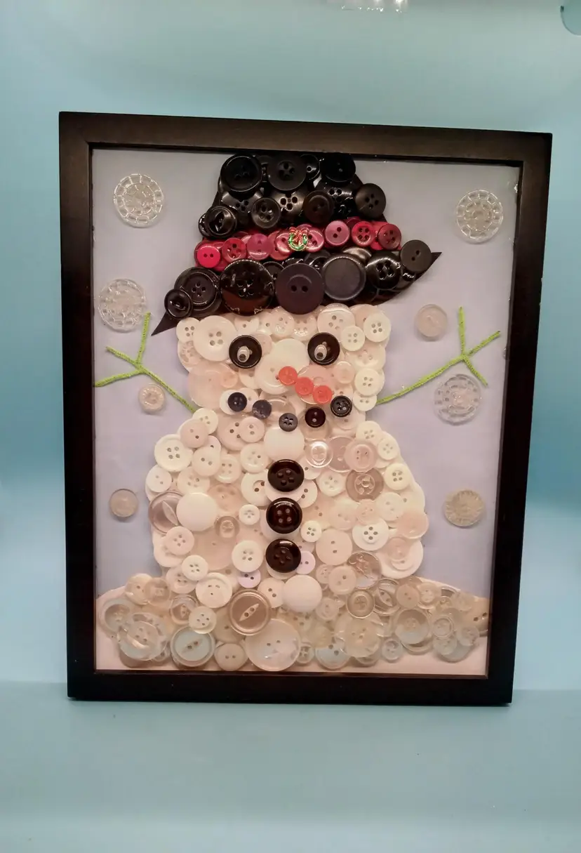 Charming handmade snowman art crafted from an assortment of buttons. This unique piece features a snowman with a black hat and twig arms, all set against a light blue background and framed in a sleek black frame. Perfect for adding a touch of whimsy to your winter decor.