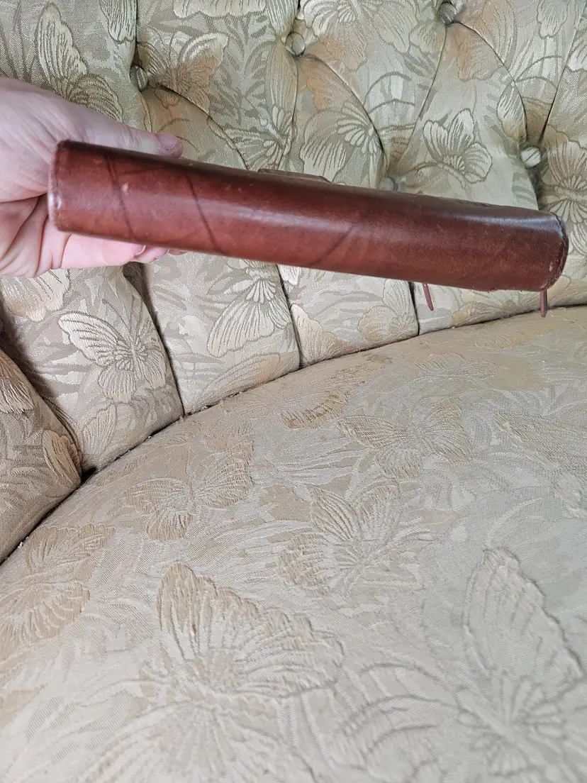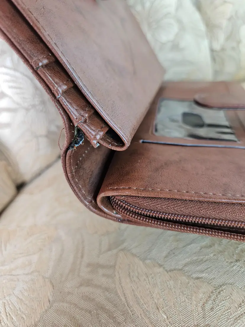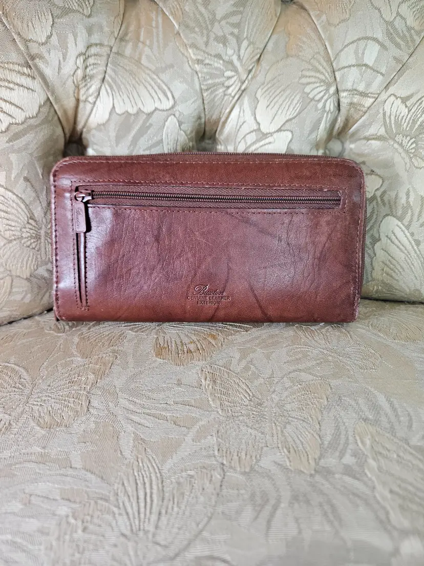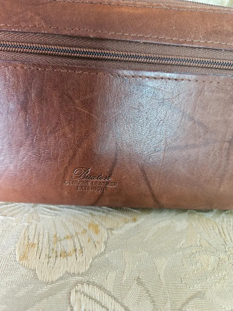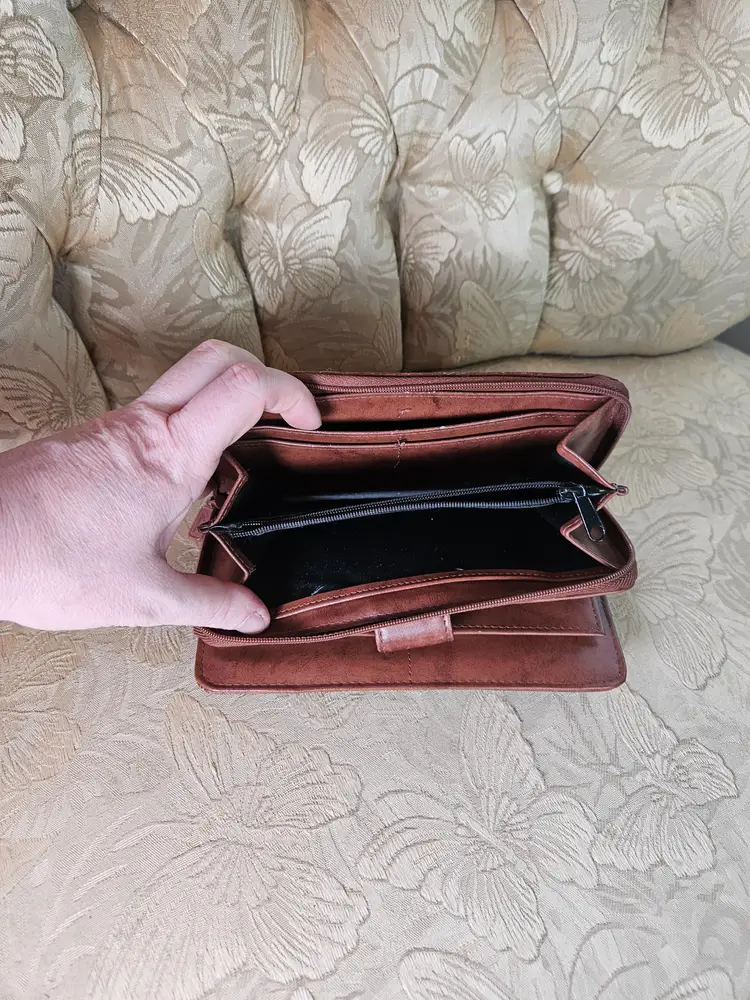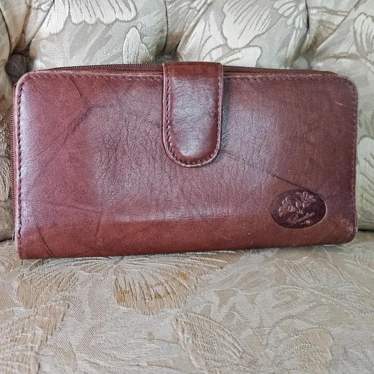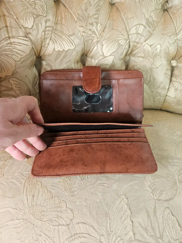 Classic brown leather wallet featuring an embossed tree design. Perfect for adding a touch of vintage charm to your everyday essentials. Gently used with a rich patina. Shows some wear on the Checkbook area.