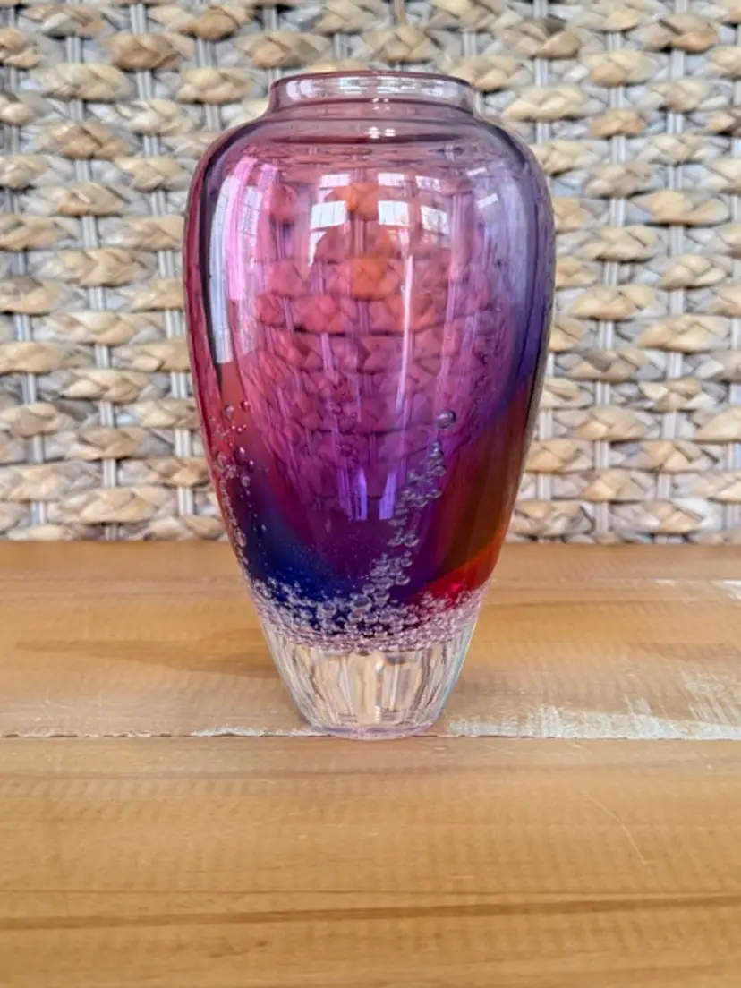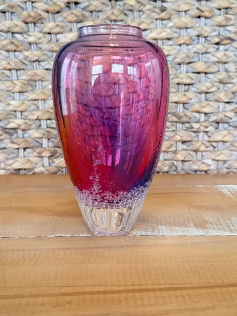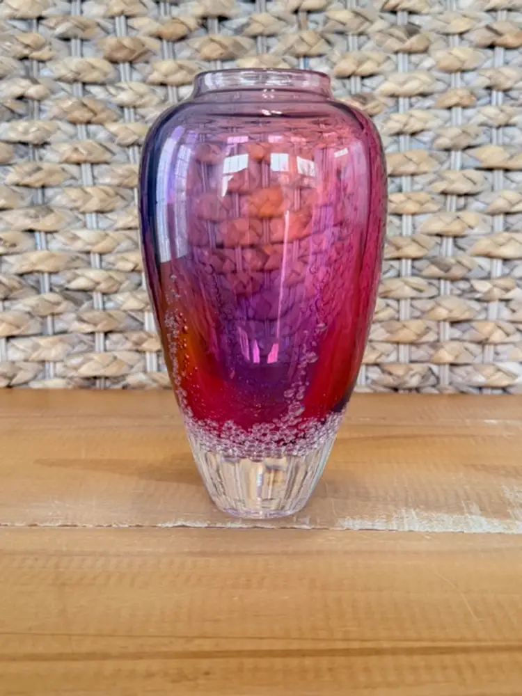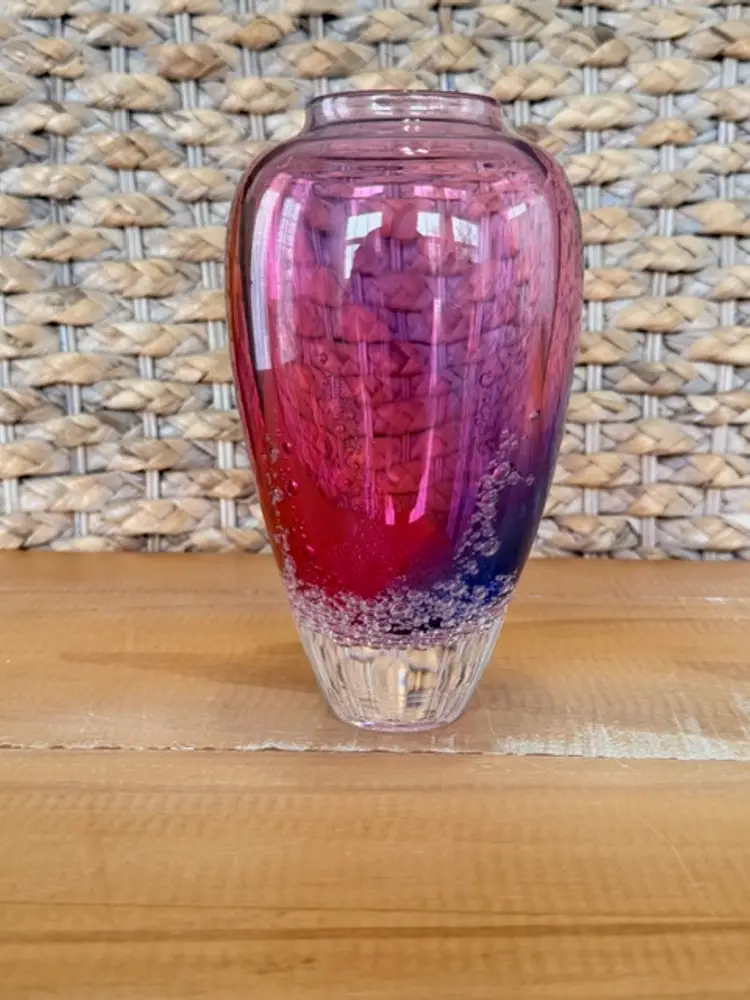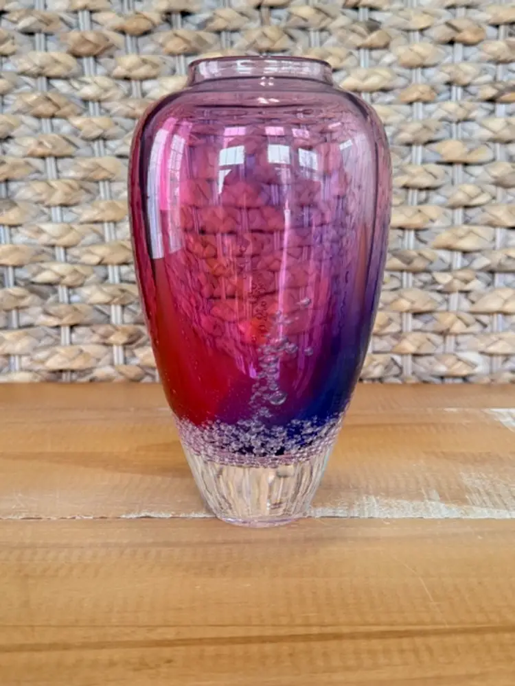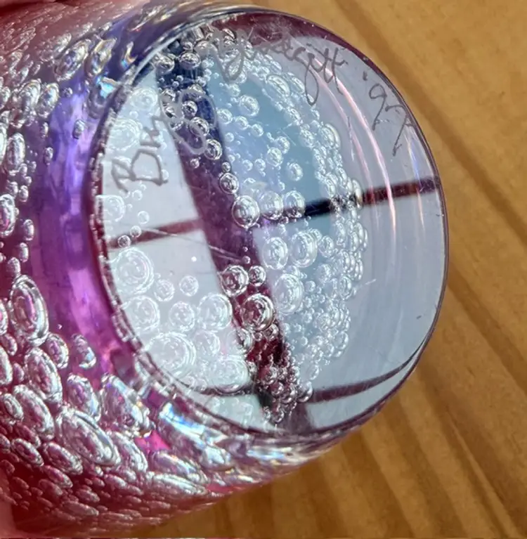 The Buzz Blodgett Studio Art Glass Sea Foam Vase, signed in 1997, is a beautiful and unique piece of handmade glass art. Standing at 6.5 inches tall, this vase features a stunning pink and purple color palette, making it a perfect addition to any art glass collection. Buzz Blodgett's signature adds authenticity and value to this vintage creation, reflecting the artistry and craftsmanship of the studio production style. This exquisite piece is a testament to the artistry and skill of its maker, making it a standout decorative item for any space.