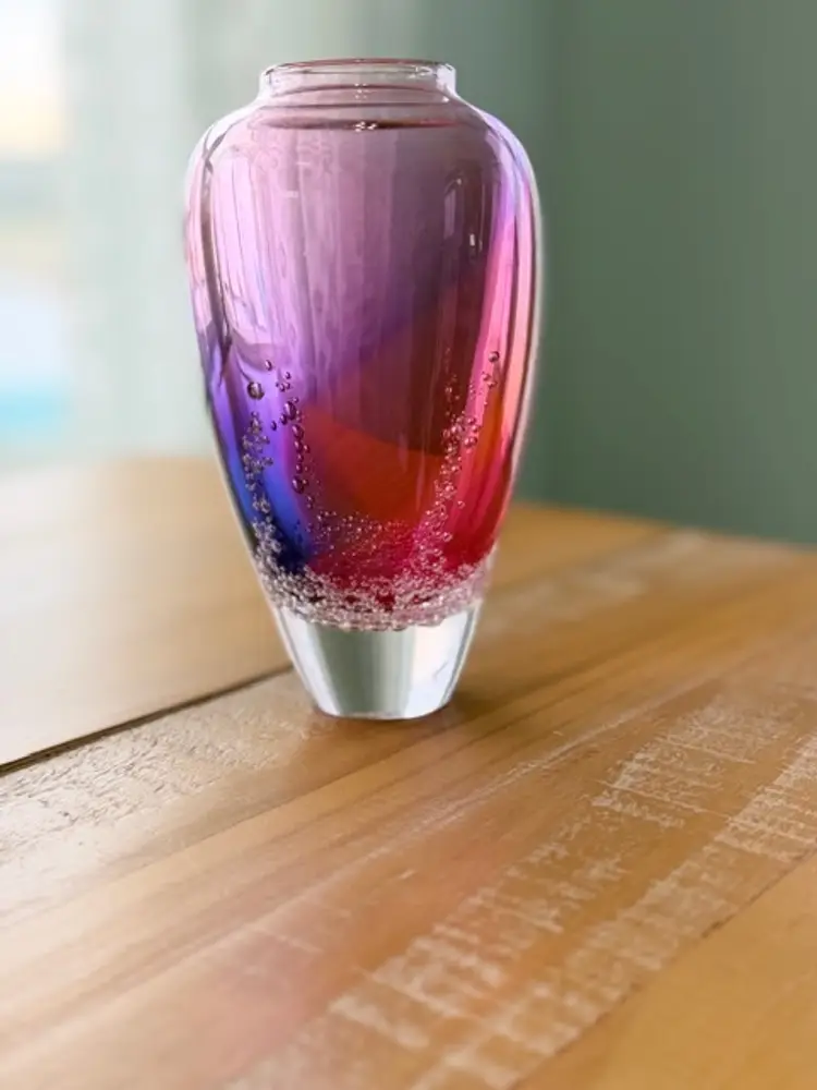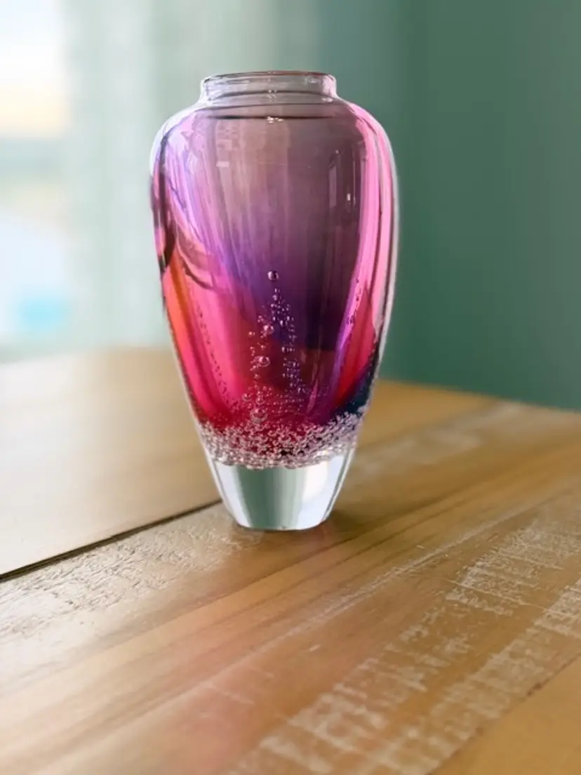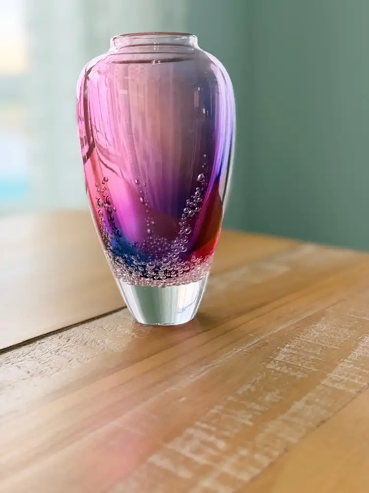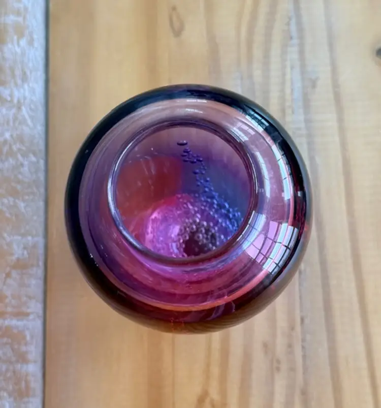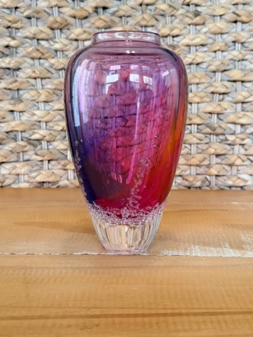 The Buzz Blodgett Studio Art Glass Sea Foam Vase, signed in 1997, is a beautiful and unique piece of handmade glass art. Standing at 6.5 inches tall, this vase features a stunning pink and purple color palette, making it a perfect addition to any art glass collection. Buzz Blodgett's signature adds authenticity and value to this vintage creation, reflecting the artistry and craftsmanship of the studio production style. This exquisite piece is a testament to the artistry and skill of its maker, making it a standout decorative item for any space.