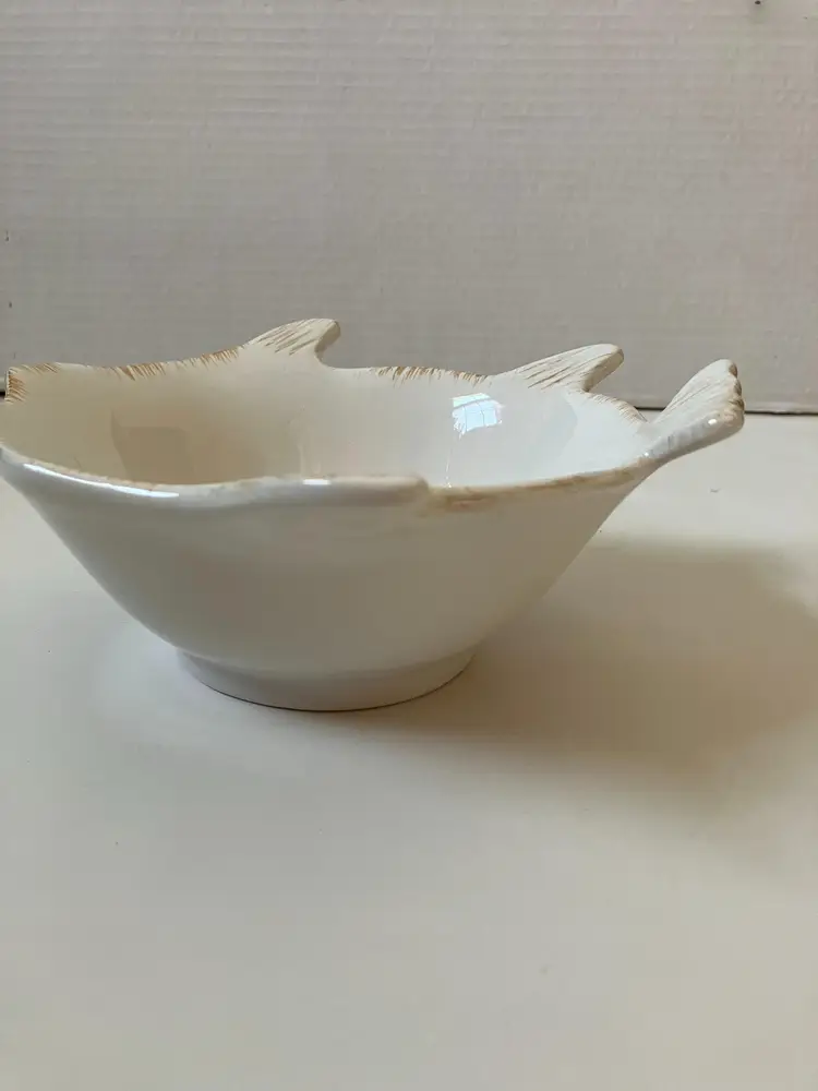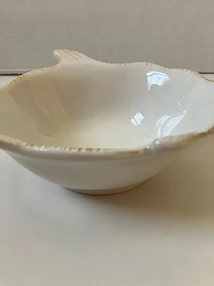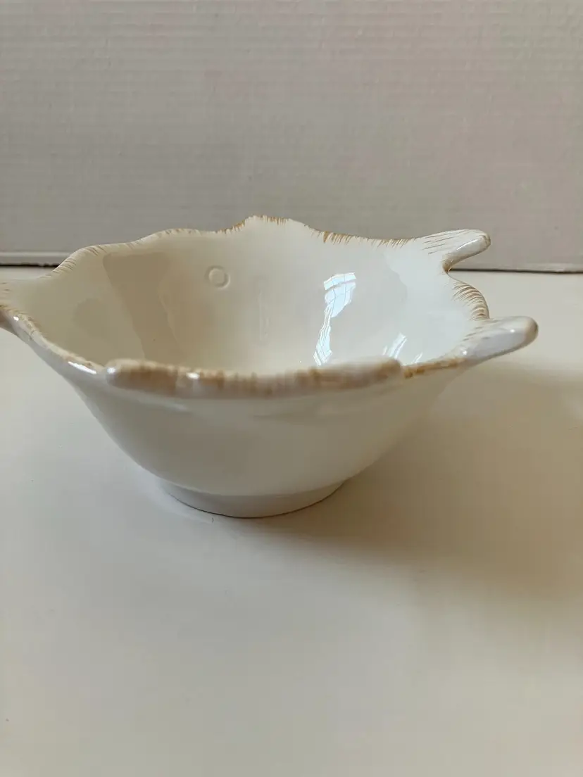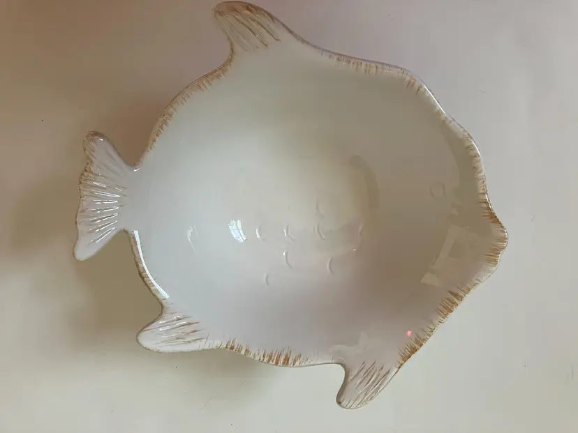 This is a cream colored bowl with yellow gold accents on the edge and fins. It has embossed details for the eye, fins and some scales. At the widest point it is 7 1/8 inches and 2 3/8 inches tall.