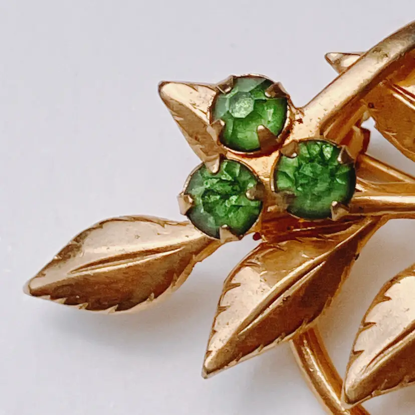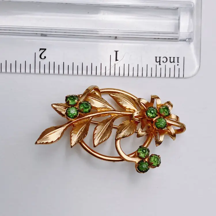 A timeless mid-century piece with classic floral styling, dimensional scrollwork, and vibrant green glass rhinestones—ideal for collectors of vintage costume jewelry or anyone drawn to elegant 1940s–50s design.