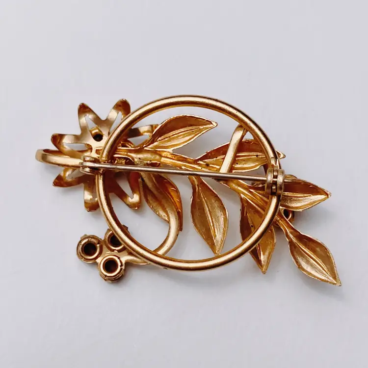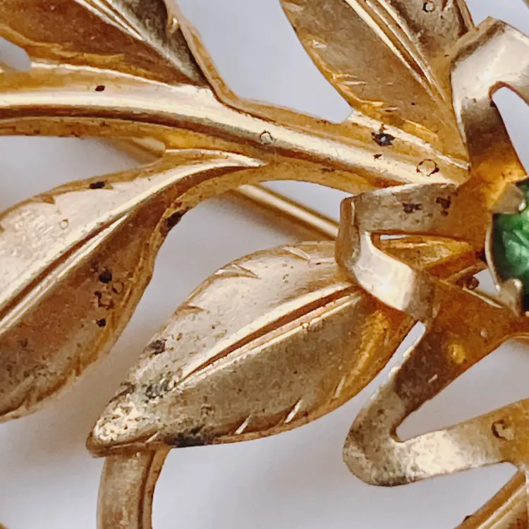 Condition: Good used / vintage condition; no missing stones; some finish wear and speckling visible on the leaves and interior areas, especially between leaf veins and in recessed sections (see back and macro views); no verdigris detected; See close-ups. Ships from a smoke-free environment.