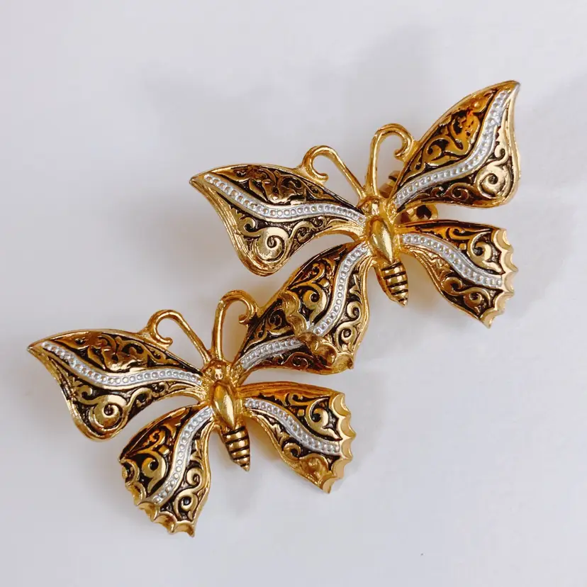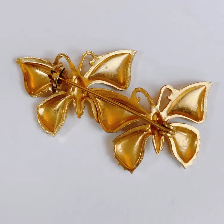 A layered butterfly design with ornate scrollwork and crisp enamel accents, this mid-century brooch blends natural whimsy with retro elegance. Its dimensional form and detailed craftsmanship make it a standout accessory for collectors and vintage enthusiasts alike.